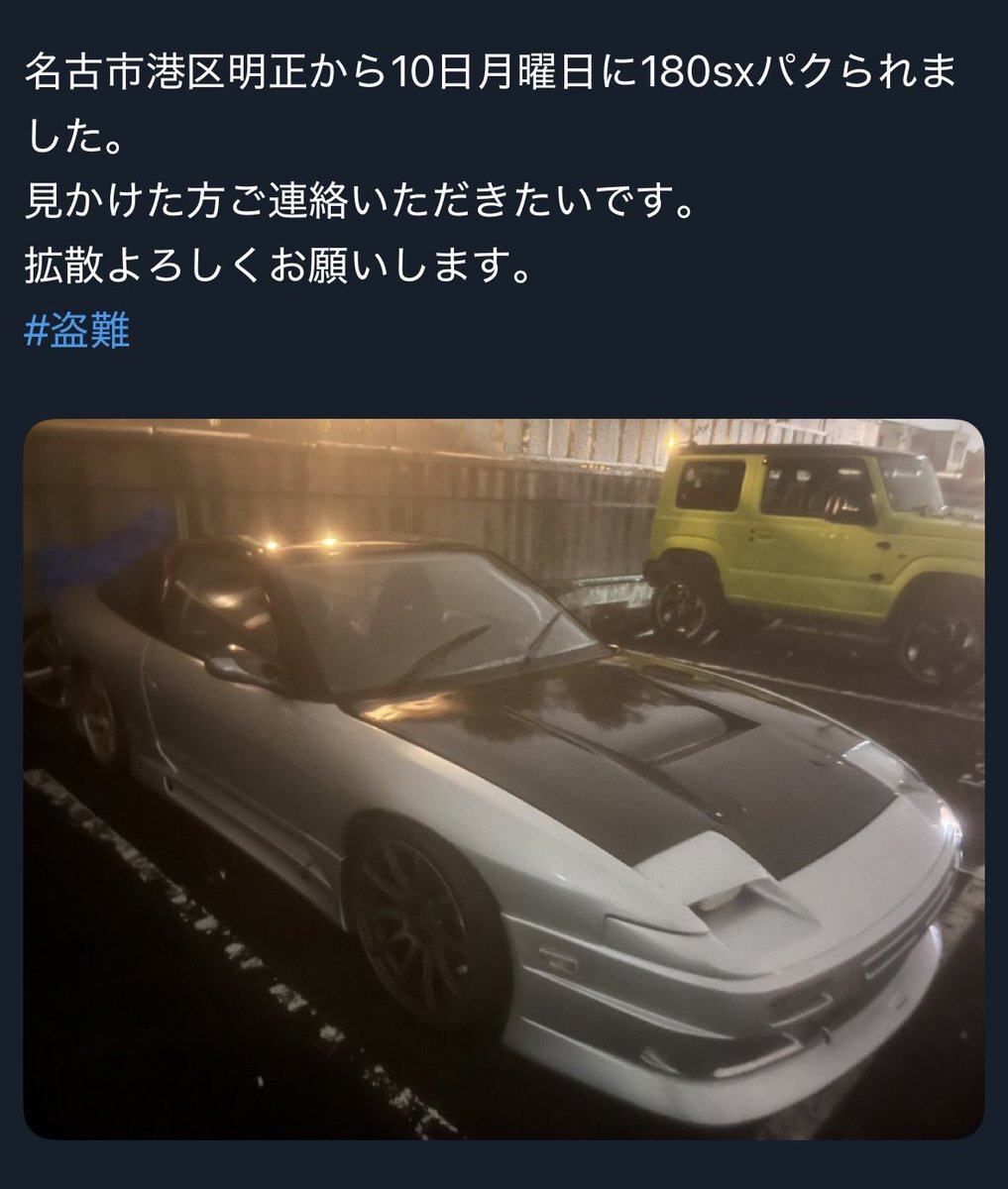 盗難情報です。 時間経っているので、もしかすると周辺にはないかもですが、どうぞよろしくお願い致します。 #盗難 #180SX #拡散希望 pic.x.com/vXPru4ynQn