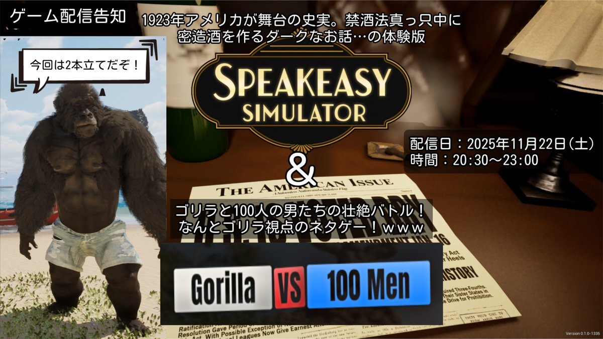 [#配信告知] 2025年11月22日(土)20:30~23:00まで 「Speakeasy Simulator Demo」と 「Gorilla VS 100 Men」の二本立てで放送! 1923年のアメリカを舞台に 密造酒を作るダークなゲームと ゴリラ視点で100人の男たちに挑む 超カオスなネタゲーを プレイしますwお楽しみに! #拡散希望 #ゲーム配信 pic.x.com/BcESd32xWb