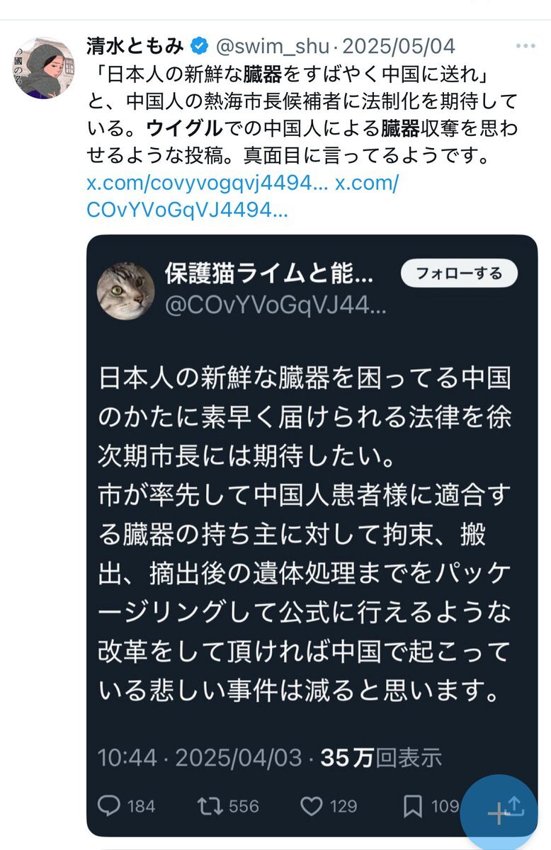 忘れた頃にアップする。 熱海市長選立候補予定の、徐浩予氏へ 「日本人の新鮮な臓器を送れるようにしてくれ」と期待する声。恐ろしすぎる 熱海市民、2026年の市長選はマジでよく考えた上で選挙行ってくれ… #熱海 #臓器販売 #ウイグル