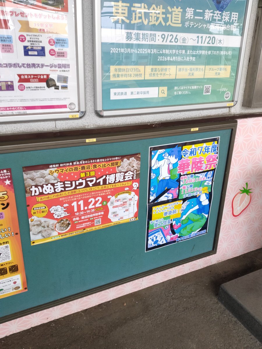 東武新鹿沼駅の掲示板 鹿沼商工高校さんの華陵祭の隣 第3回かぬまシウマイ博覧会 2025 11/22(土) 10:30~14:30【雨天決行】 会場:鹿沼市役所駐車場 #シウマイ博覧会 #拡散希望します #かぬまシウマイ博覧会2025 #鹿沼 #栃木県 #かぬまシウマイ pic.x.com/Se5XwjmGqH