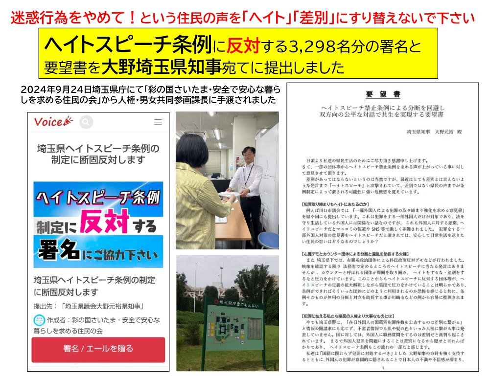 #拡散希望します 皆様のご協力で集まった #埼玉県ヘイトスピーチ条例反対 の署名3,298人分と #大野埼玉県知事 あて要望書が9月24日、埼玉県庁にて提出されました。 要望書全文は⬇️ ⚠️極左活動家から地元メンバーへの激しい攻撃や脅迫が予想され危険な為、代理で私が安全な神奈川から発信しました。 pic.x.com/leljPkiitG x.com/Jordu04776828/…