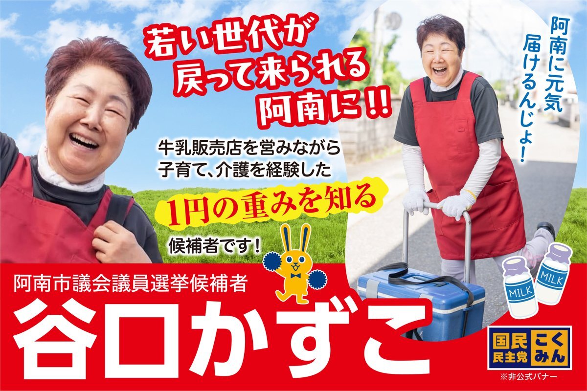 #拡散希望します‼️ 🙇🏻♀️阿南市の有権者の皆さまへ🙇🏻♀️ 明日の阿南市議会議員選挙では、国民民主党・推薦の #谷口和子 さんに投票をお願い致しますm(_ _)m 若い世代が戻って来れる阿南にしたい‼️ 牛乳販売店を営みながら子育て・介護を経験した1円の重みを知る候補 #谷口和子 pic.x.com/WPwEU7yzgI