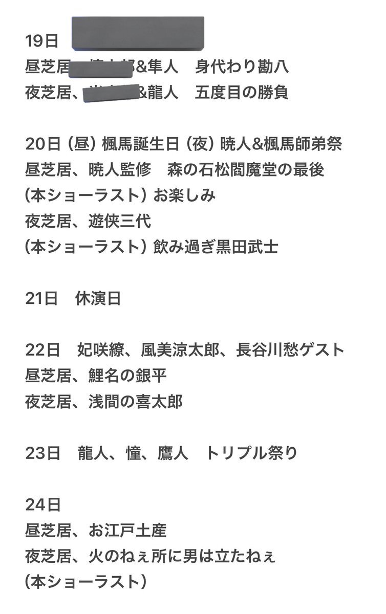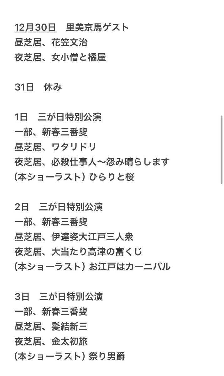 お待たせしました 2026年浅草木馬館1月公演 演目投下💣致します🙇♂️ まだ隠してる所もありますが、 是非皆様ご来場下さい❗️ #拡散希望RTお願い致します 1月木馬館 予定 12月30日 里美京馬ゲスト 昼芝居、花笠文治 夜芝居、女小僧と橘屋 31日 休み 1日 三が日特別公演 一部、新春三番叟 pic.x.com/7LysmupfZL