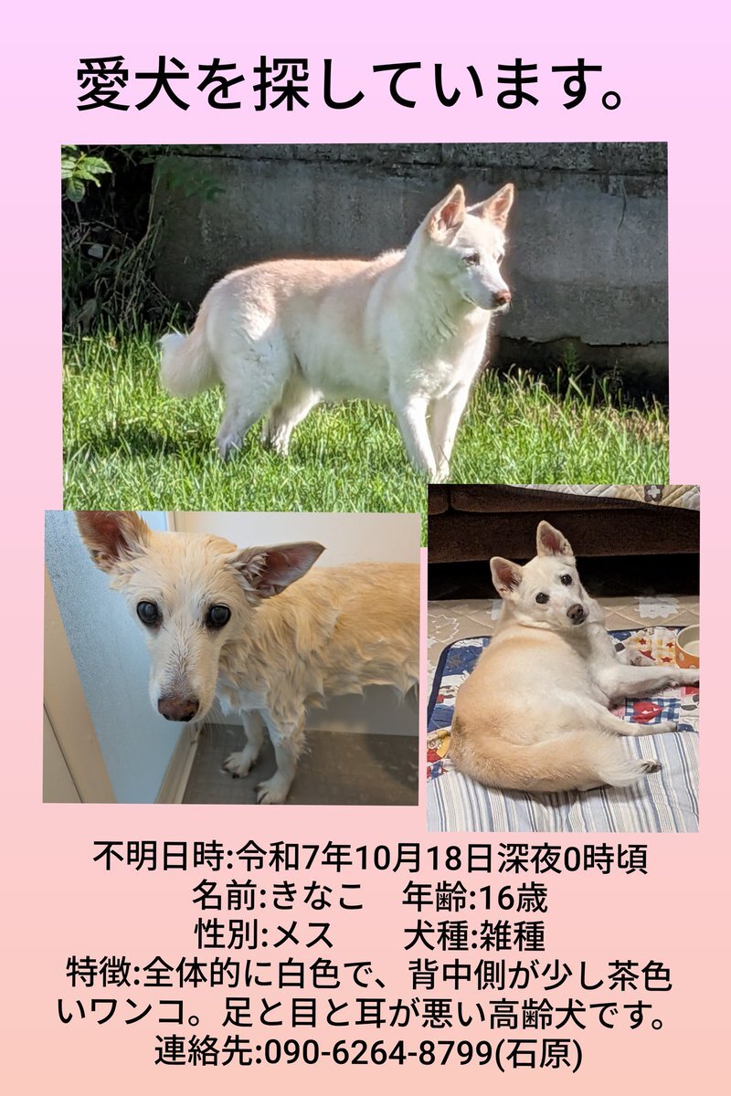 いきなりですみません。 本日、稚内市で愛犬の「きなこ」が居なくなってしまいました。 足目耳が悪い高齢犬でそこまで自宅から遠くにはいってないとは、思っています。 どのような情報でもありましたらください。お願いします! 住所:稚内市栄 連絡先:090-6264-8799(石原) #犬 #探しています #迷い犬