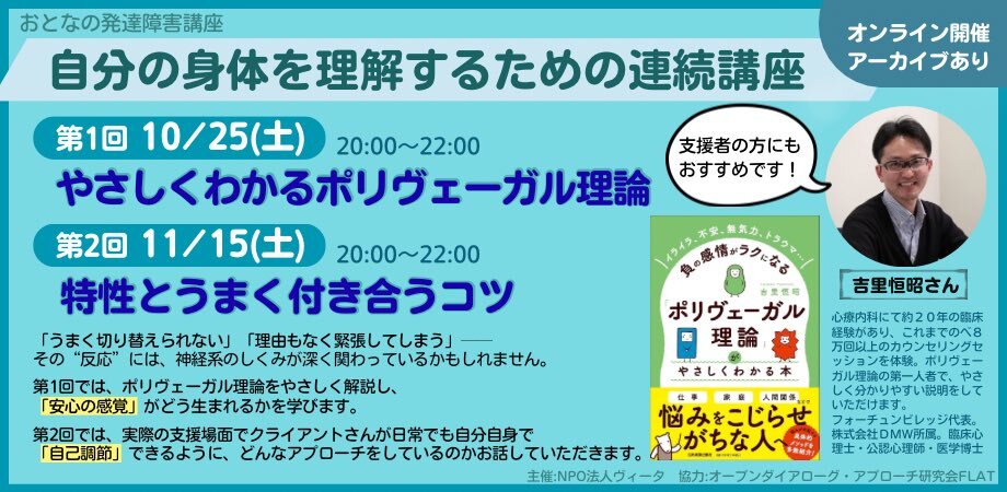 #拡散希望RTご協力お願い致します 10月25日、11月15日連続講座! ポリヴェーガル理論×発達特性 📘「負の感情がラクになる本」で話題 第一人者の吉里恒昭さん(臨床心理士/医学博士)によるオンライン講座! 感情・対人関係・安心のしくみを、神経から優しくひもときます。 当事者も支援者も!詳細👇 pic.x.com/R81ge3Ap4M
