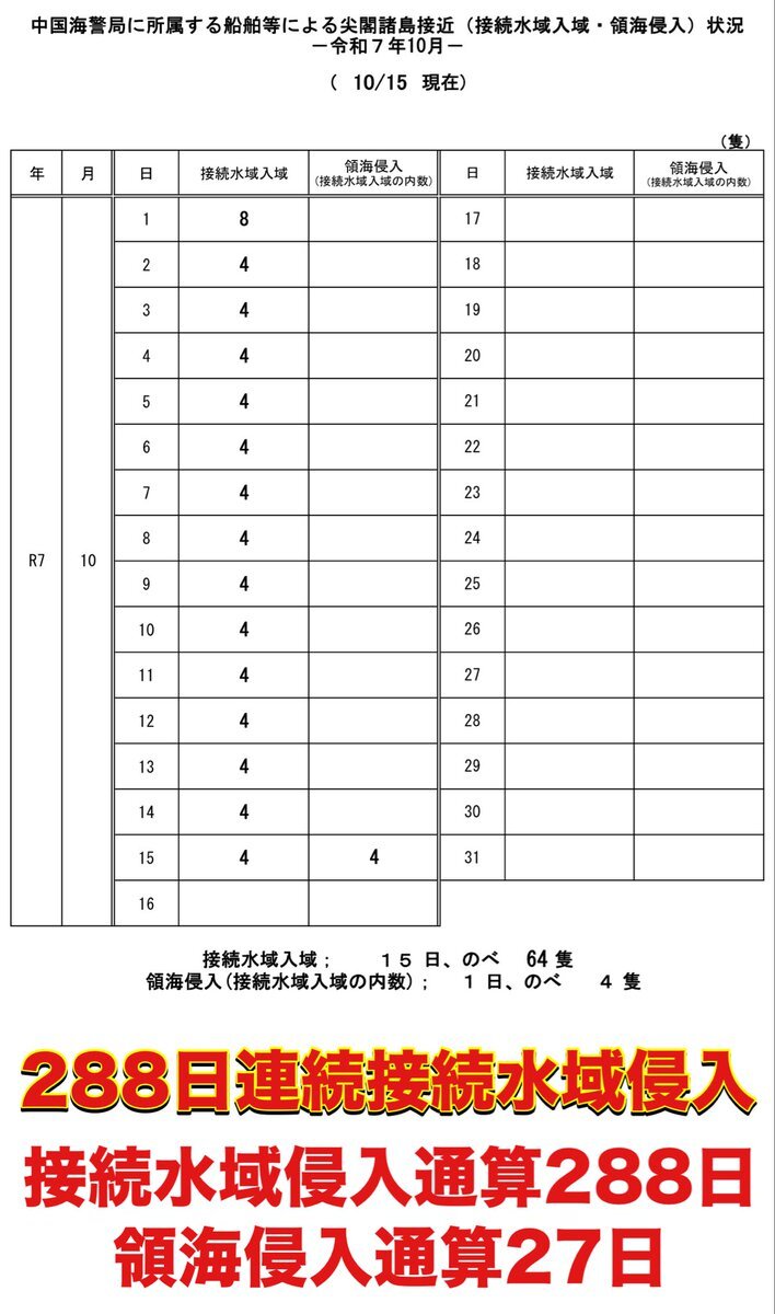 #拡散希望RTご協力お願い致します おはようございます! 10/17マピオン発表 #尖閣諸島天気予報 10/15海上保安庁発表 中国海警局所属船の尖閣諸島接近状況をお知らせします。 離島国境の危機を知り領土への関心を高めましょう! #尖閣諸島問題に取り組まない政治家を私は支持しません pic.x.com/DwBdotT2tp