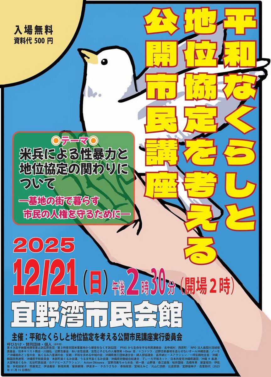 🌺平和なくらしと地位協定を考える公開市民講座 2025年12月21日(日)午後2時30分~ 宜野湾市民会館(宜野湾市野嵩1-1-2) ☎ 098-893-4433 テーマ:米兵による性暴力と地位協定の関わりについて ー基地の街で暮らす市民の人権を守るためにー 入場無料 #皆で広げよう #指ひとつでできる応援 👹拡散願う pic.x.com/IIplN02pfH