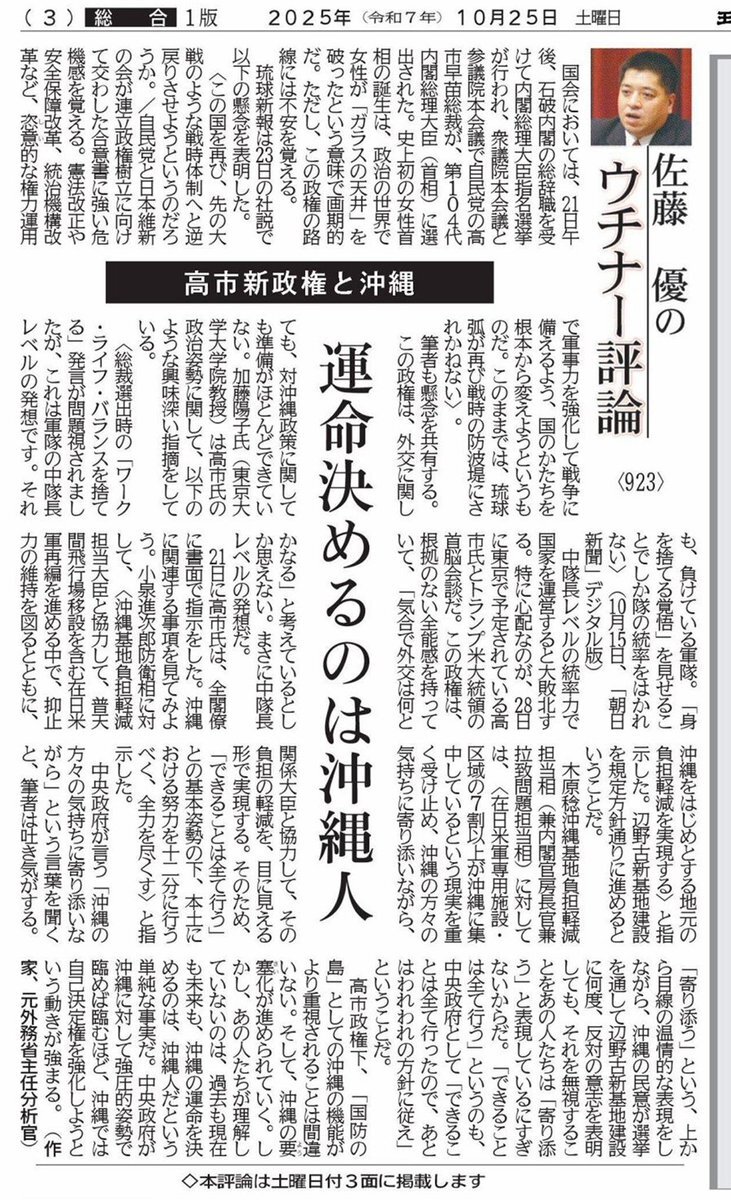 🌺《#佐藤優のウチナー評論》〈923〉#高市新政権と沖縄 #運命決めるのは沖縄人 10月25日琉球新報3面』を添付 ryukyushimpo.jp/news/politics/… 🌺…皆で広げよう📲☎指ひとつでできる応援… #沖縄を二度と戦場にさせない #皆で広げよう #指ひとつでできる応援 👹拡散願う pic.x.com/fZhxtxFfvQ