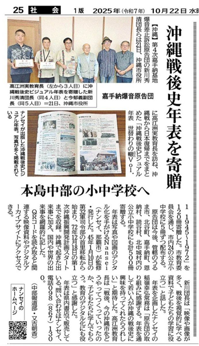 🌺「沖縄戦後史年表を寄贈 嘉手納爆音原告団 本島中部の小中学校へ 2025年10月22日沖縄タイムス25面』を添付します。 okinawatimes.co.jp/articles/-/169… #沖縄戦後史年表を寄贈 #嘉手納爆音原告団 #本島中部の小中学校へ #沖縄タイムス #皆で広げよう #指ひとつでできる応援 🌻拡散願う pic.x.com/2nWgb7EhXF