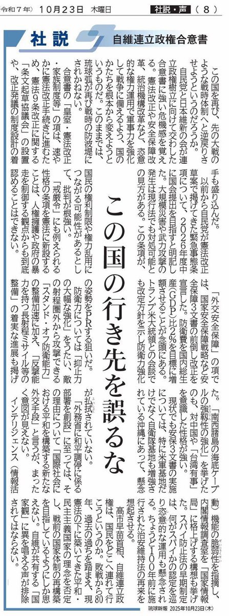 🌺#社説 #自維連立政権合意書 #この国の行き先を誤るな 10月23日琉球新報8面』を添付 ryukyushimpo.jp/editorial/entr… 🌺…皆で広げよう📲☎指ひとつでできる応援… #沖縄を二度と戦場にさせない #皆で広げよう #指ひとつでできる応援 👹拡散願う pic.x.com/HZNLBJMi7k