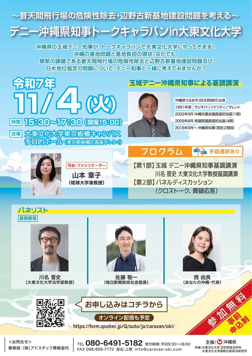 【参加受付中】関東圏にお住いの皆さん、普天間飛行場の危険性除去と辺野古新基地建設問題などについて、玉城デニー沖縄県知事と一緒に考えてみませんか?入場無料です。 日時:11月4日(火)15時半~17時半 会場:大東文化大学(東京板橋キャンパス多目的ホール)お申し込み→form.qooker.jp/Q/auto/ja/cara…