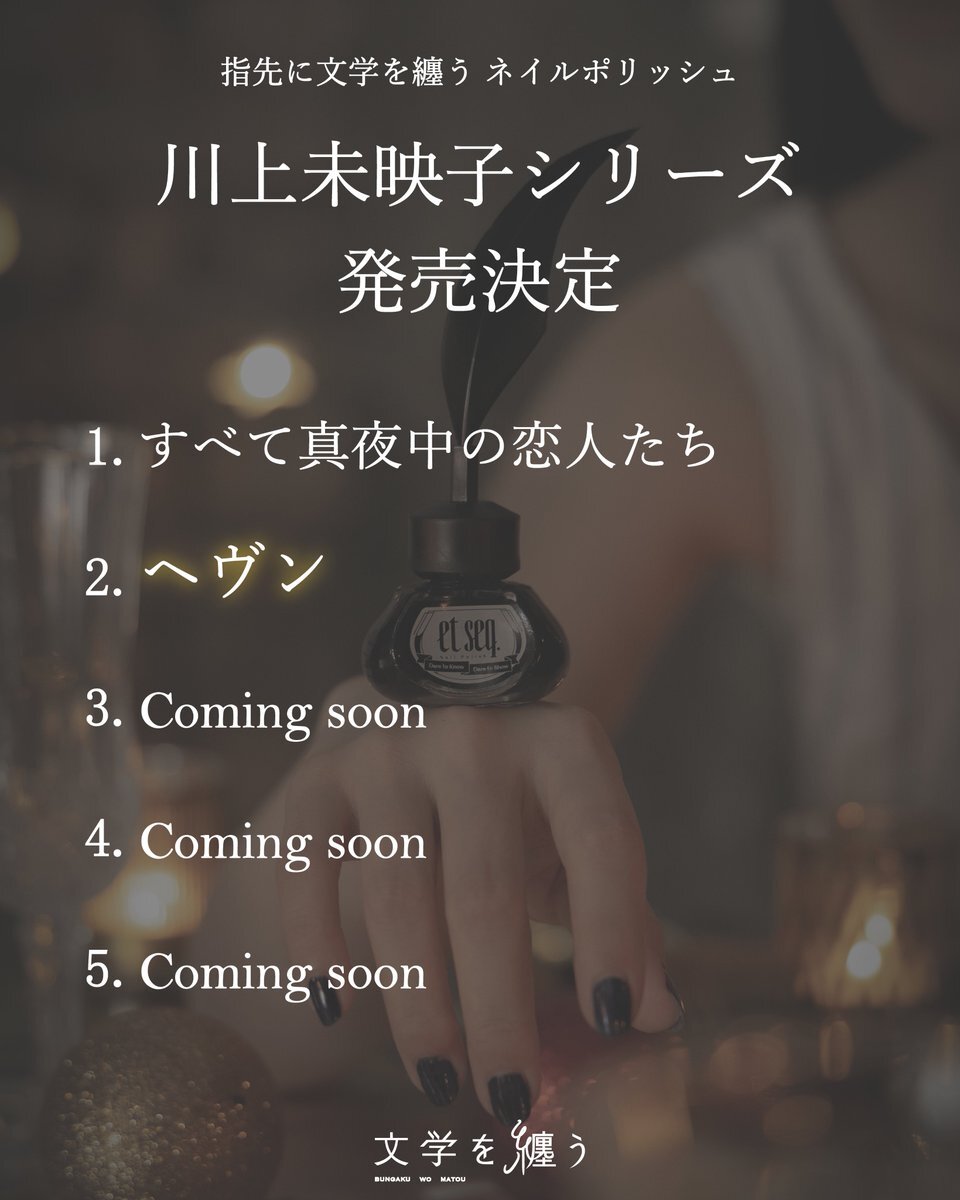 ◤ ̄ ̄ ̄ ̄ ̄ ̄ ̄ ̄ ̄ ̄ ̄ ̄ ̄ ̄  #指先に文学を纏う シリーズ   「#川上未映子」発売決定 _______________◢ et seq.×「#文学を纏う」コラボ新シリーズが12月に発売決定🎉 本日は作品ラインナップを2つ目をご紹介📚 2.『#ヘヴン』 2022年「ブッカー国際賞」最終候補作。 pic.x.com/kIAPMWDYne