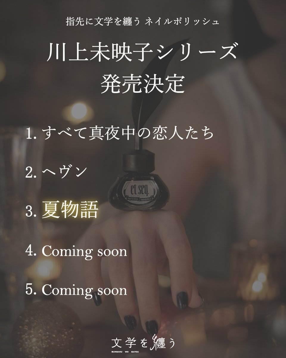 ◤ ̄ ̄ ̄ ̄ ̄ ̄ ̄ ̄ ̄ ̄ ̄ ̄ ̄ ̄  #指先に文学を纏う シリーズ   「#川上未映子」発売決定 _______________◢ et seq.×「#文学を纏う」コラボ新シリーズが12月に発売決定🎉 本日は作品ラインナップを3つ目をご紹介📚 3.『#夏物語pic.x.com/bHjawOHzpg