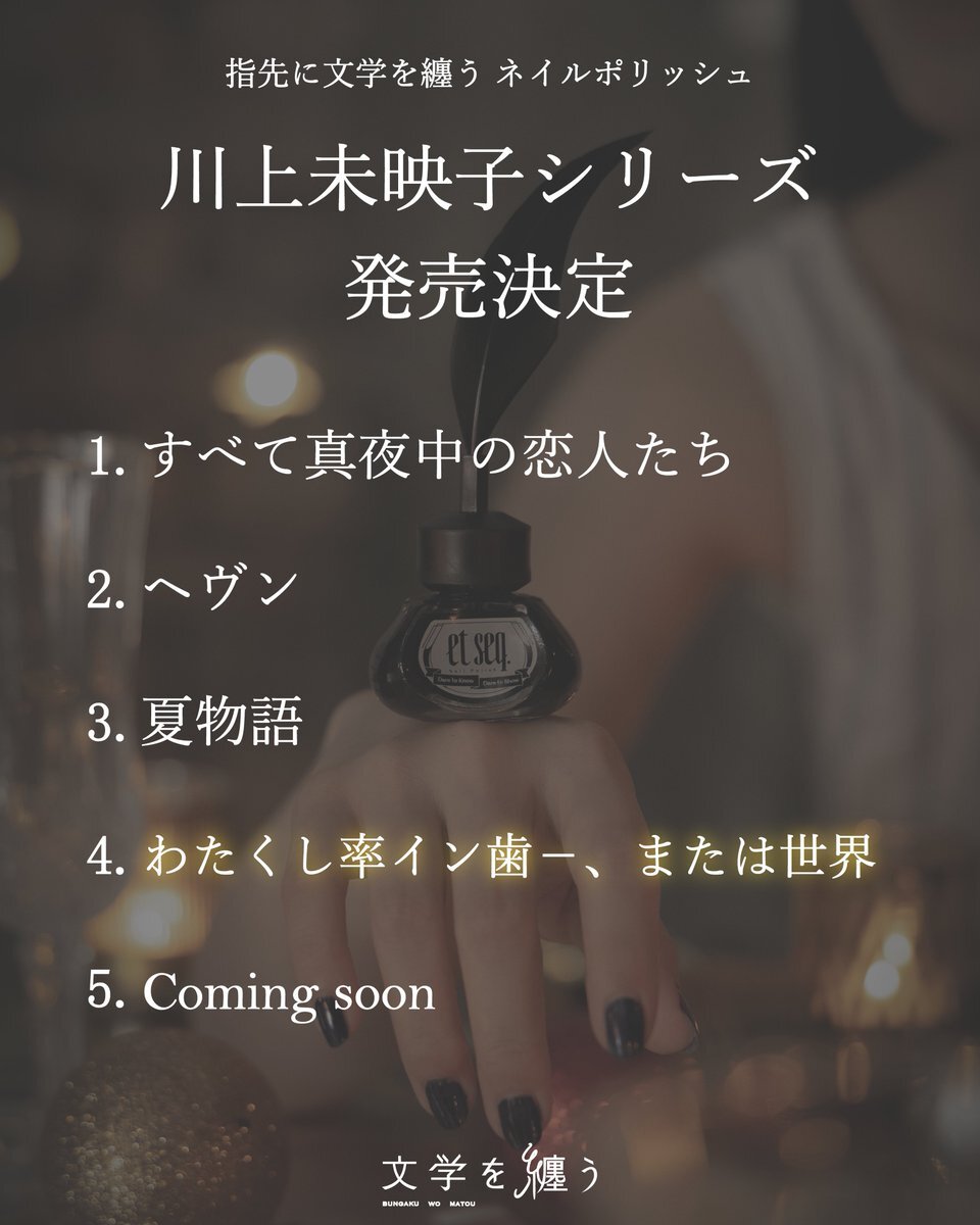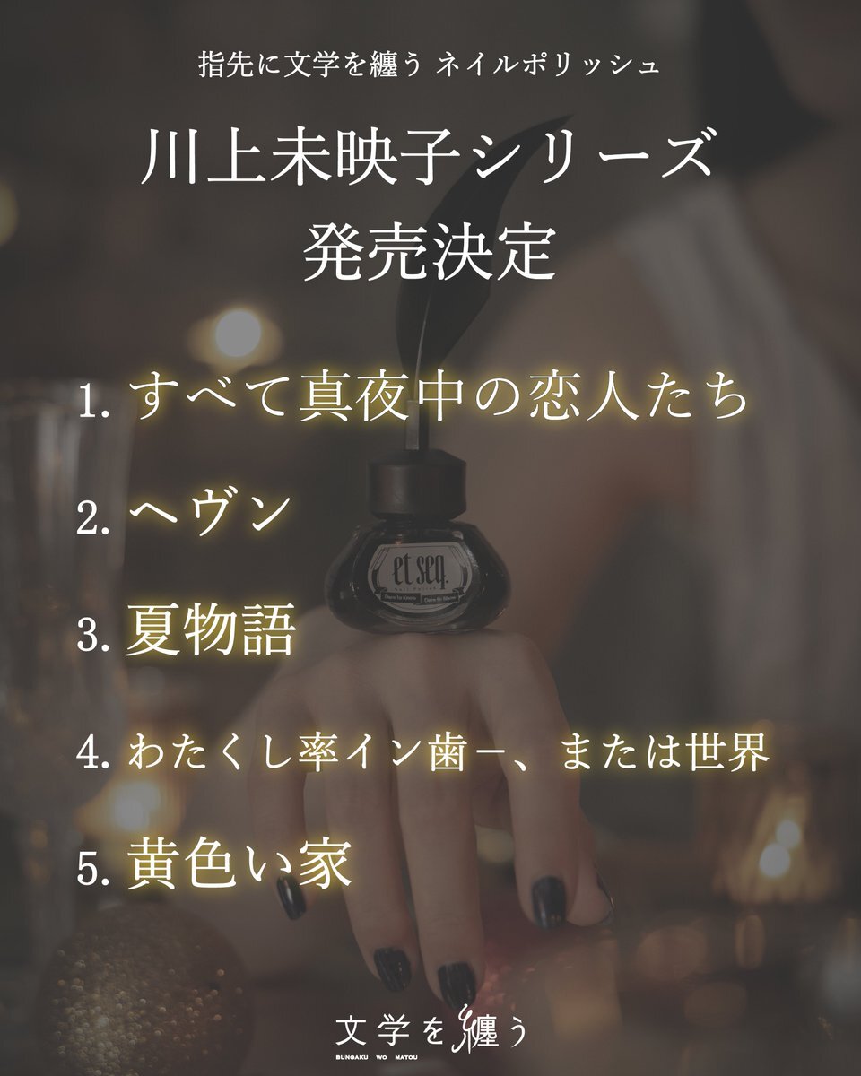◤ ̄ ̄ ̄ ̄ ̄ ̄ ̄ ̄ ̄ ̄ ̄ ̄ ̄ ̄  #指先に文学を纏う シリーズ   「#川上未映子」発売決定 _______________◢ et seq.×「#文学を纏う」コラボ新シリーズが12月に発売決定🎉 『#すべて真夜中の恋人たち』 『#ヘヴン』 『#夏物語』 『#わたくし率イン歯ー、または世界』 pic.x.com/mJ8fUrJEja