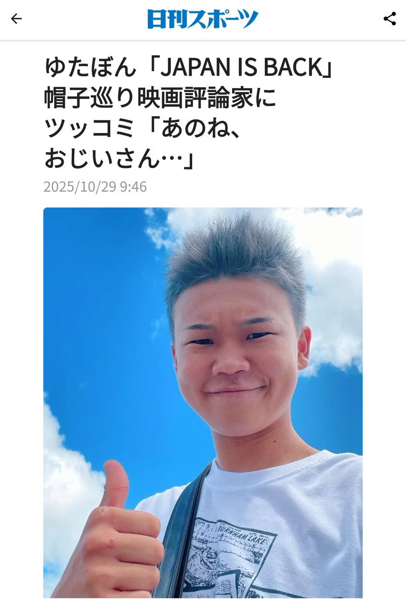"ゆたぼん「JAPAN IS BACK」帽子巡り映画評論家にツッコミ「あのね、おじいさん…」" l.smartnews.com/m-6tTmeIuI/32r…❇️ #皮肉 #指摘 #勉強になって良かったね! 😄😄😄 threads.com/@ziyonsukeakur…❇️ Instagram.com/ziyonsukeakurou❇️ #ジョン🚬 #チャック🕶️ 🇯🇵🎌🗾 🤟🤙🤞 pic.x.com/WeOADz9Ngi