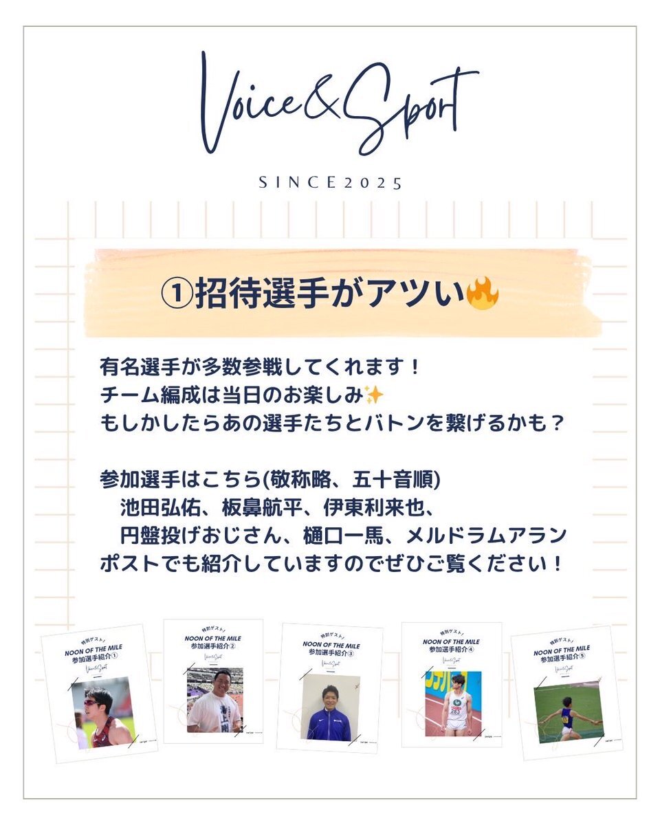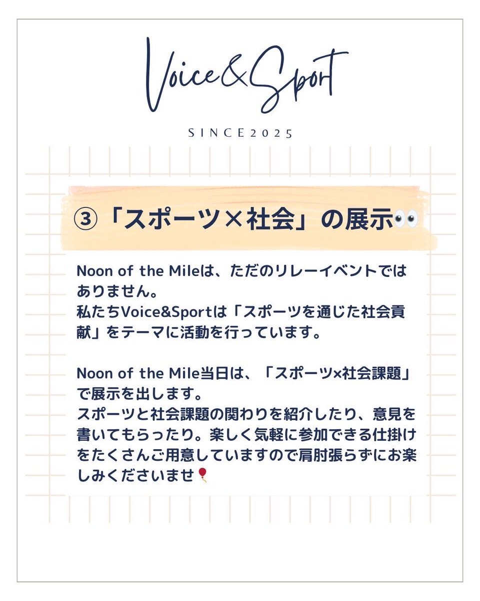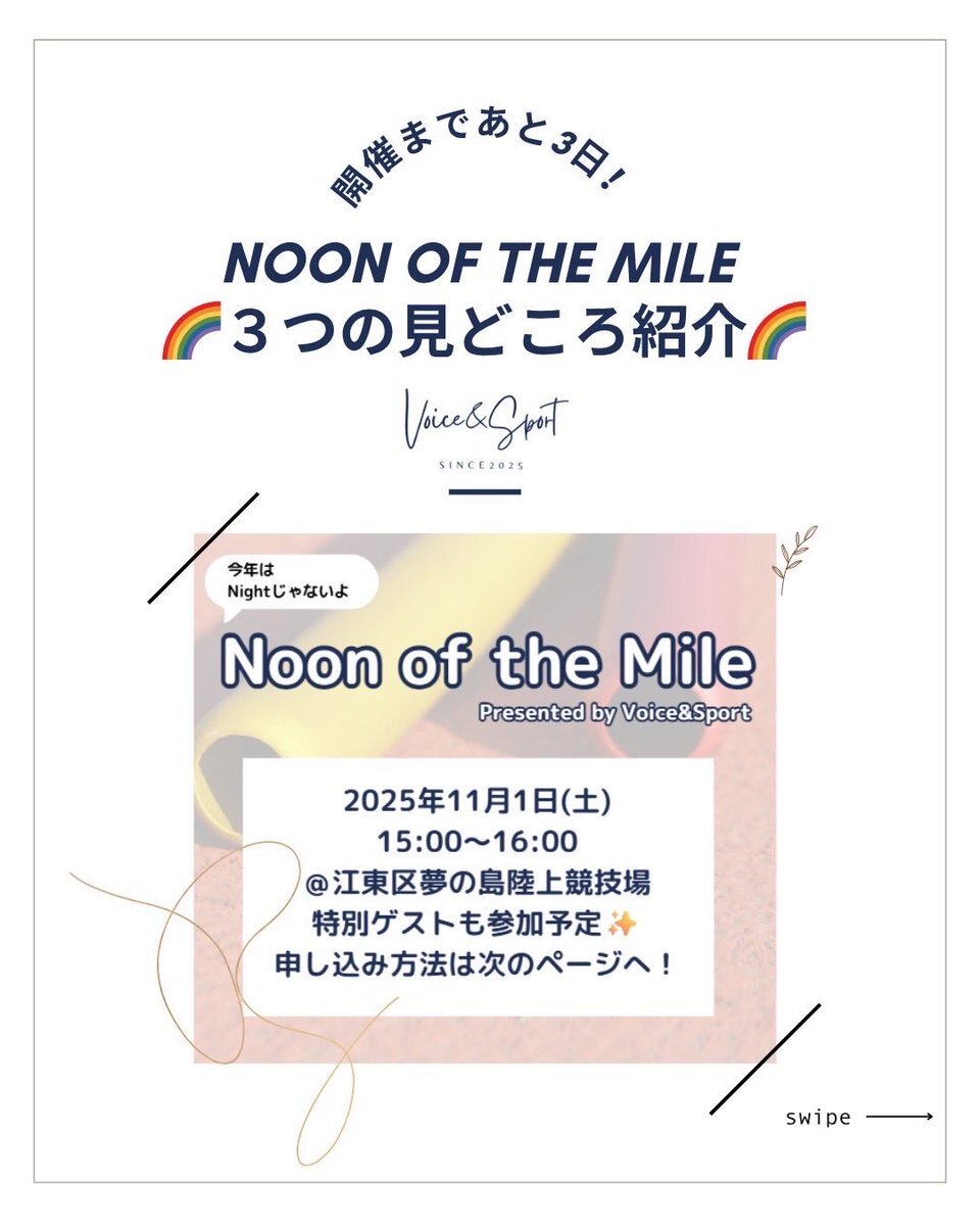 【Noon of the Mileまであと2日!】 🌈見どころ3選紹介!🌈 11月1日(土)に開催されるNoon of the Mileの見どころをご紹介します✨ ① 参加選手がアツい🔥 ② 誰でも参加OK👌🏼 ③「スポーツ×社会」の展示👀 詳しくは画像をチェック! #noonofthemile #voiceandsport #挑戦の力を社会の力へ #relay pic.x.com/cv1eYPLsUO
