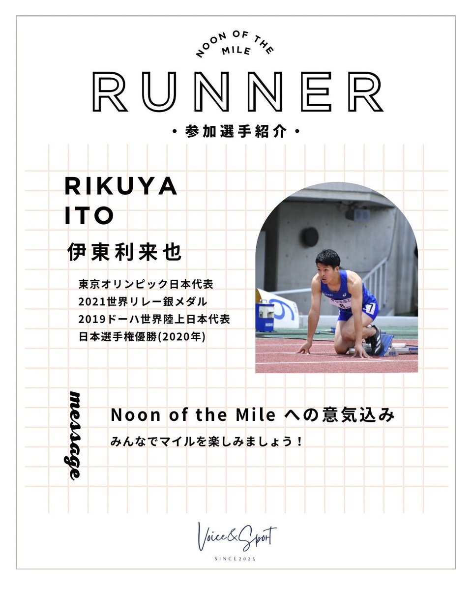 【参加選手紹介③】 11/1(土)に行う、Noon of the Mile に出場するゲスト選手を紹介します! 3人目は伊東利来也選手です! 数々の大会でメダルを取っていらっしゃいます✨ 4人目は誰でしょうか…! 次回のポストもお楽しみに!👀✨ #voiceandsport #noonofthemile #挑戦の力を社会の力へ pic.x.com/dOg7aOVlaZ
