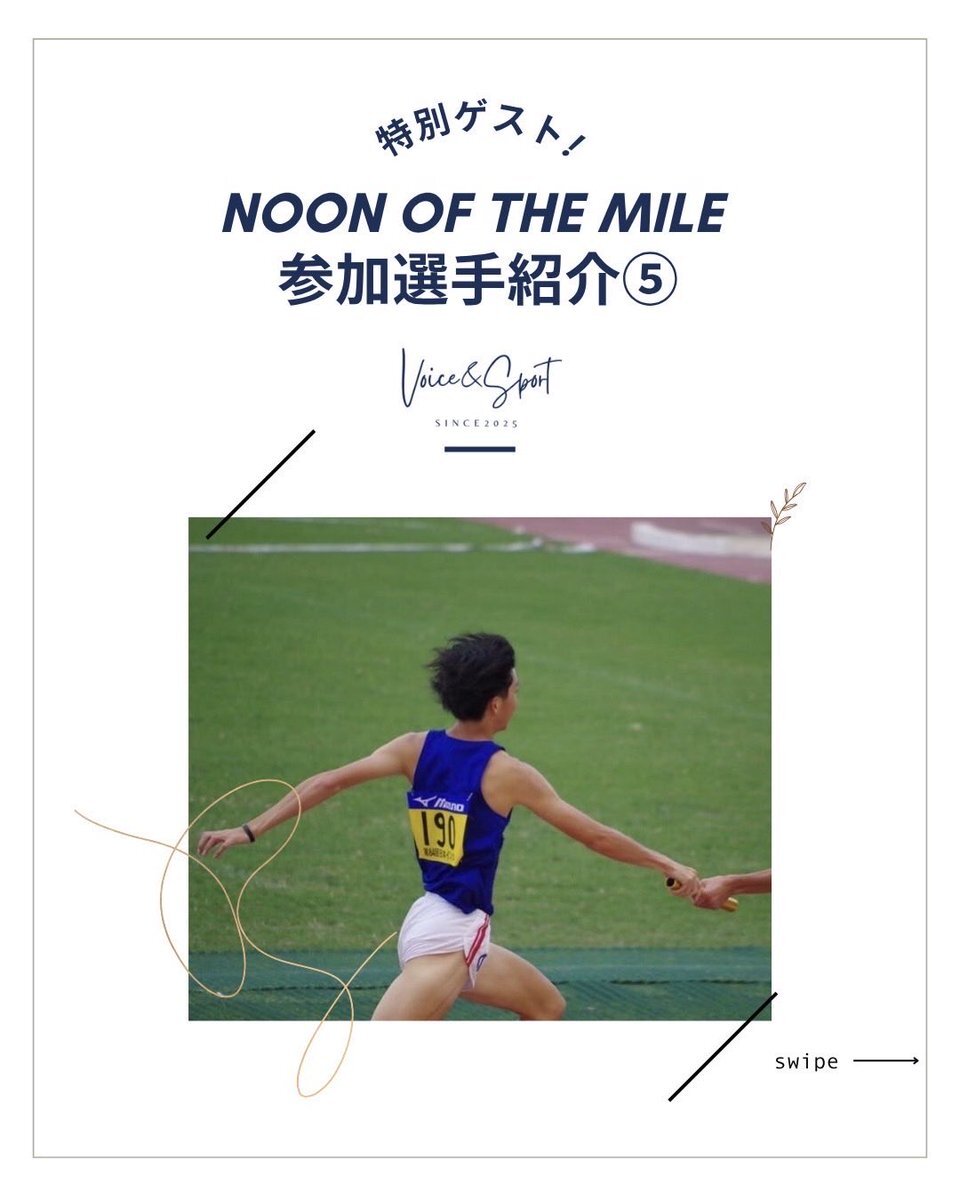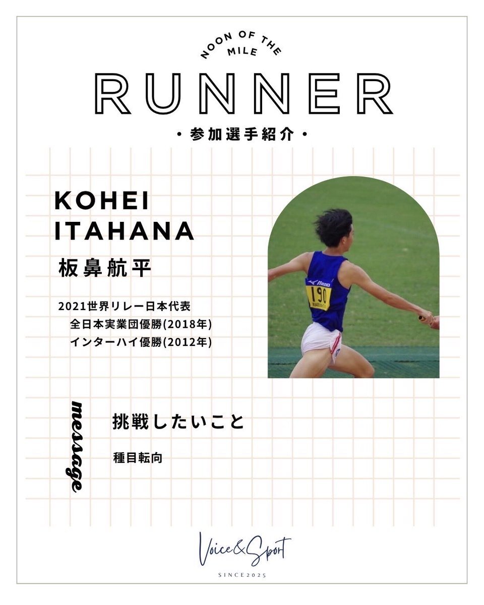【参加選手紹介⑤】 11/1(土)に行うNoon of the Mile に出場するゲスト選手を紹介します! 5人目は板鼻航平選手です! 忙しいスケジュールやコンディション調整して参加してくださいます🙇🏻‍♀️ 次回の紹介もお楽しみに!👀✨ #voiceandsport #noonofthemile #挑戦の力を社会の力へ pic.x.com/K4z5YcoaCi