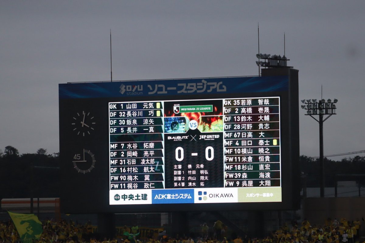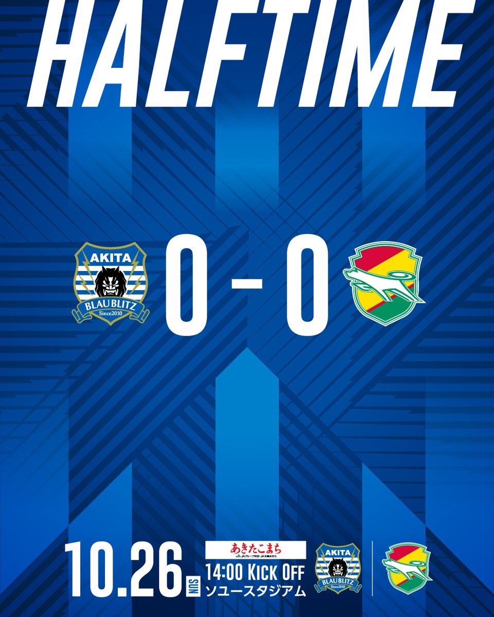 🔹𝗛𝗔𝗟𝗙 𝗧𝗜𝗠𝗘🔹 #ブラウブリッツ秋田 0-0 #ジェフユナイテッド千葉 前半は守る展開。 押し込まれシュートを打たれる場面が目立つも、ゴールは許さず。 後半は主導権を握り、得点を! 熱い応援よろしくお願いいたします。 #Jリーグ #秋田一体魂