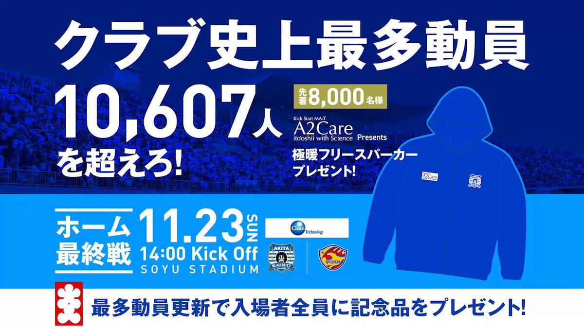 #ブラウブリッツ秋田 では、ホーム最終戦を「史上最多動員10,607人を超えろ!」と題し、ブラウブリッツ秋田過去最大の入場者数を目指すプロジェクトを実施します。 当日は先着8000名様に #A2Care Presents「極暖フリースパーカー」を進呈🎁 #岩瀨浩介 代表取締役社長のご挨拶です。 #秋田一体魂