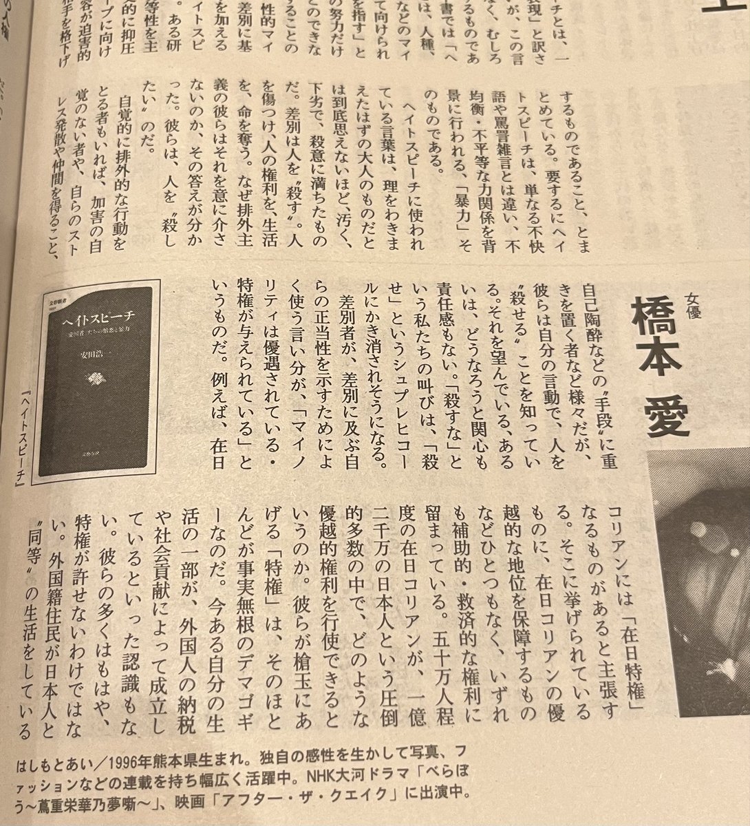 読みながら震えた。発売中の『週刊文春』。女優の橋本愛さんによる「私の読書日記」である。なんと、2015年に私が書いた『ヘイトスピーチ・「愛国者」たちの憎悪と暴力」(文春新書・現在は電子書籍で発売中)が取り上げられていた。しかも、その「日記」の中身が単なる書評の域を超え、完璧なヘイトスピ