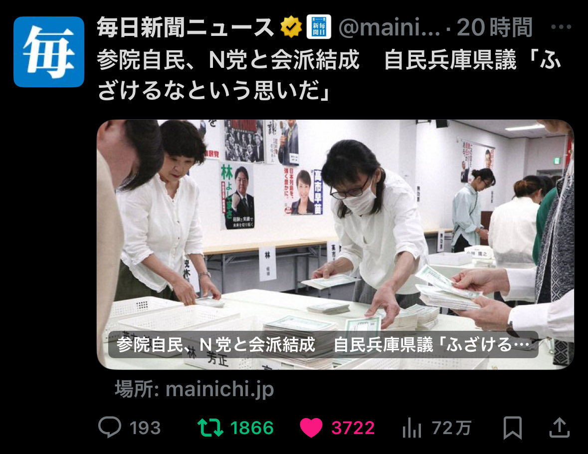 🚨毎日新聞よくやった👍 参院自民、N党と会派結成 自民兵庫県議「ふざけるなという思いだ」 | 毎日新聞 他のメディアも続け🫵 N・自・維・参 #えぬじいさん #統一教会政権 #排外主義政権 #極右政権 #統一教会 #世界平和統一家庭連合 #勝共連合 #世界日報 mainichi.jp/articles/20251…