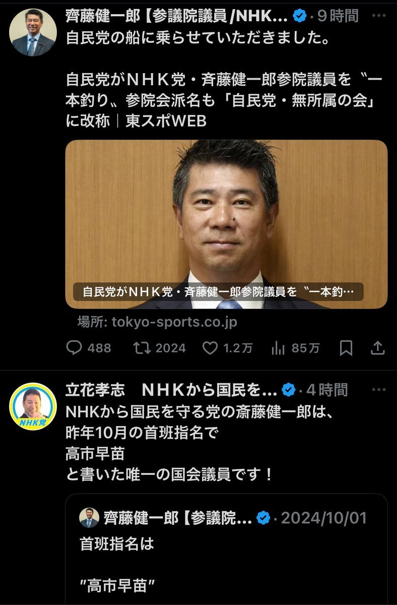 返信先:@NODAYOSHI55他1人野田さん、参議院自民が反社会的カルト集団NHK党との統一会派組んだことを追求してください🤦♀️ まさしく統一教会連立政権のよう🏺 N・自・維・参 #えぬじいさん 政権名 #統一教会政権 別名 #排外主義政権 #極右政権 関連団体 #統一教会 #世界平和統一家庭連合 #勝共連合 #世界日報