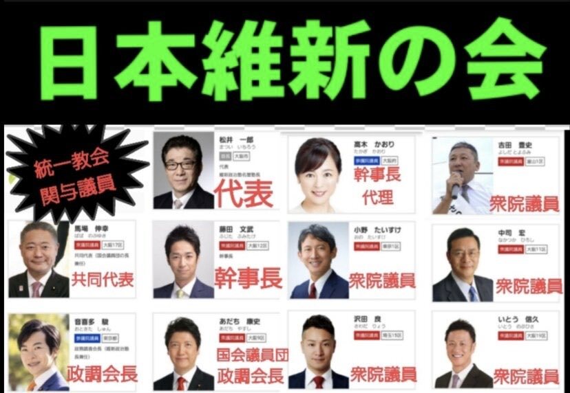 返信先:@gogoichiro松井さん、論点ずらしやめなはれ 問題はNHK党と参議院自民が統一会派を組んだこと それを蔑ろにして維新が自民に近寄ったら維新も自滅するよ N・自・維・参 #えぬじいさん 政権名 #統一教会政権 別名 #排外主義政権 #極右政権 関連団体 #統一教会 #世界平和統一家庭連合 #勝共連合 #世界日報