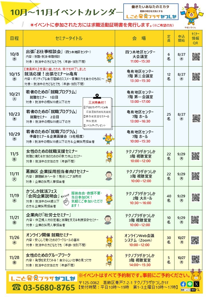 🌈#しごと発見プラザかつしか 10月-11月のイベントカレンダーです! #求職者 向けに #就職 #就活 に役立つセミナーやお仕事相談会、企業 #採用担当者 向けに採用力向上セミナー等を開催します。 詳しくはHP🔽をご覧ください☺️ katsushika-shigoto.net/news_category/… #葛飾区 #しごと探し pic.x.com/H2qv0Ki2k3