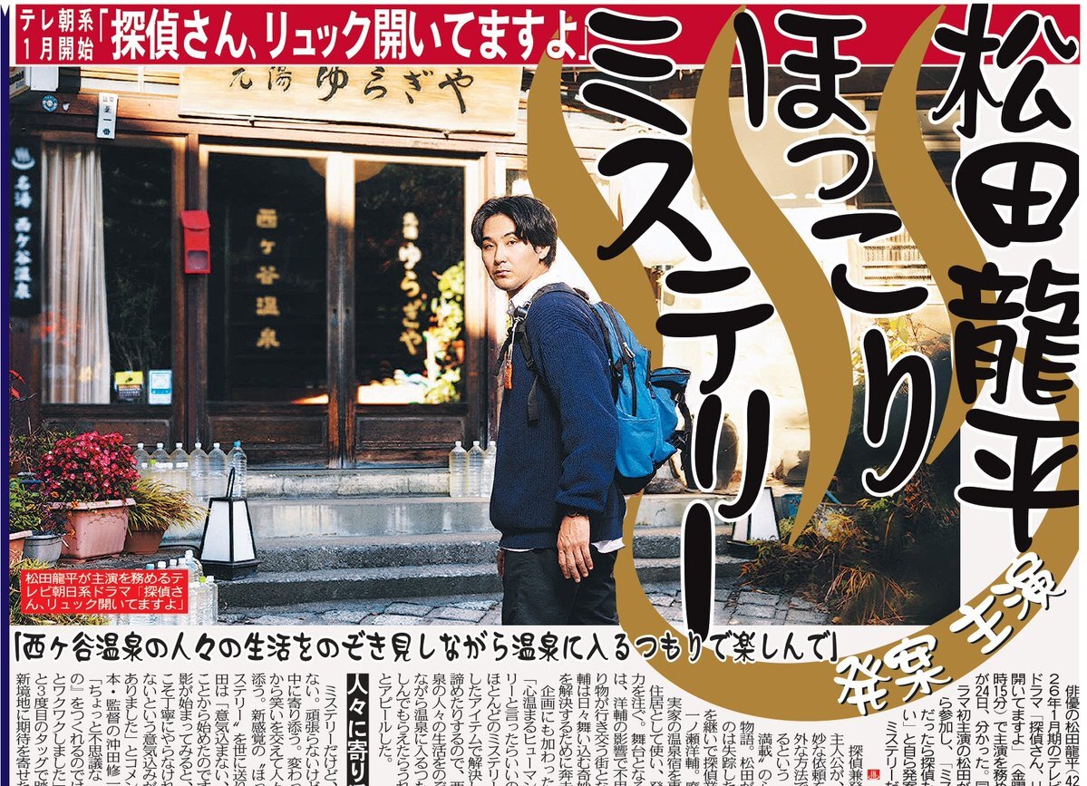 ♨️情報解禁♨️ 探偵さん、リュック開いてますよ  ̄ ̄ ̄ ̄ ̄ ̄ ̄ ̄ ̄ ̄ ̄ ̄ ̄ ̄ ̄ #松田龍平 主演! 温泉街の<探偵> 兼 <発明家>が ヘンテコ依頼をゆる〜く解決🔍 新感覚、ほっこり♨️ミステリー✨ 2026年1月スタート🎒 #探偵リュック