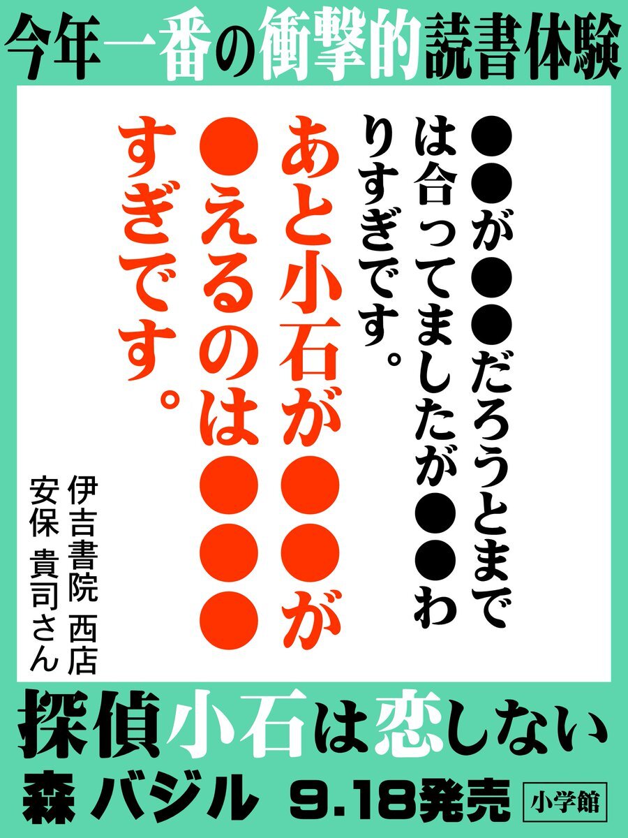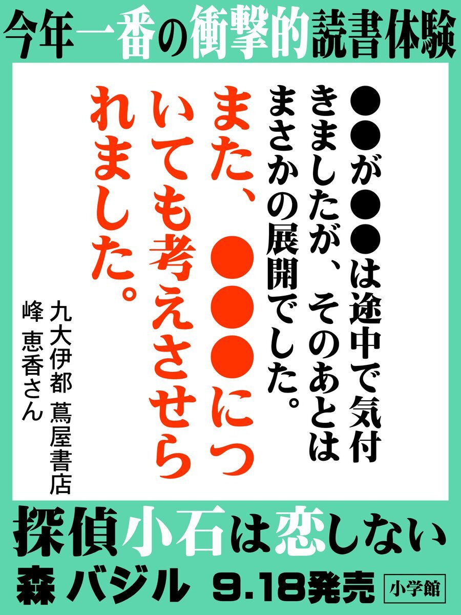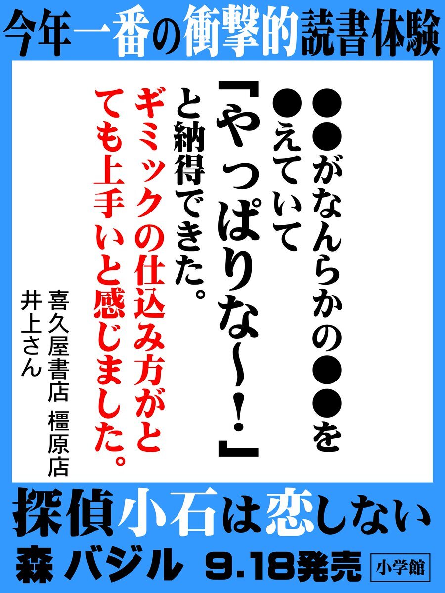 \今年一番の衝撃的読書体験!/ 『探偵小石は恋しない』(森バジル) 大反響につき続々重版決定です🎉🎉 全国の書店員様からいただいたご感想を紹介! 本日は伊吉書院 西店の安保 貴司さんの感想です📖 ⚠️ネタバレ“全開”の感想は特設サイトまで⚠️ shogakukan.co.jp/pr/tanteikoish… #探偵小石は恋しない pic.x.com/ZRor5dOY0b