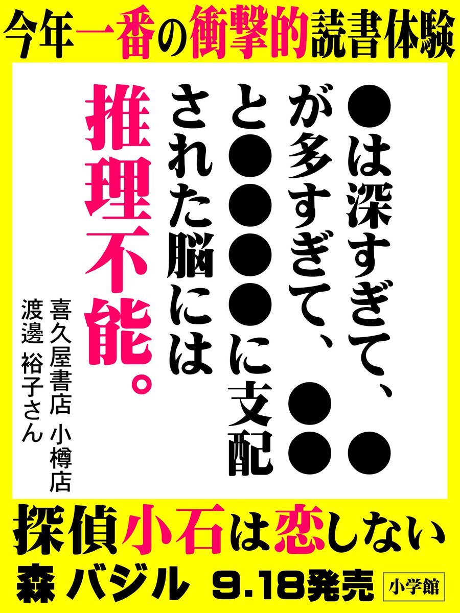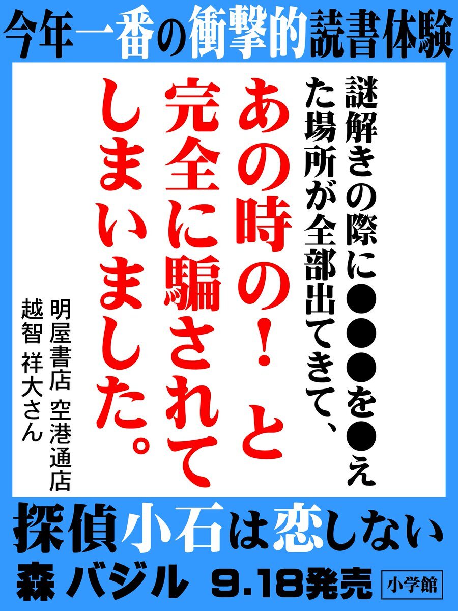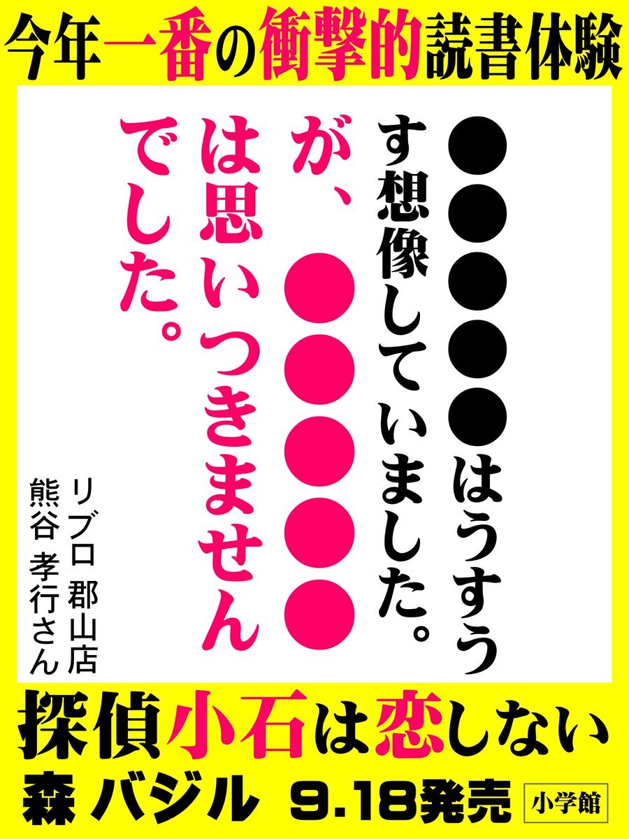 \今年一番の衝撃的読書体験!/ 『探偵小石は恋しない』(森バジル) 大反響につき続々重版決定です🎉🎉 全国の書店員様からいただいたご感想を紹介! 本日は伊吉書院 西店の安保 貴司さんの感想です📖 ⚠️ネタバレ“全開”の感想は特設サイトまで⚠️ shogakukan.co.jp/pr/tanteikoish… #探偵小石は恋しない pic.x.com/ZRor5dOY0b