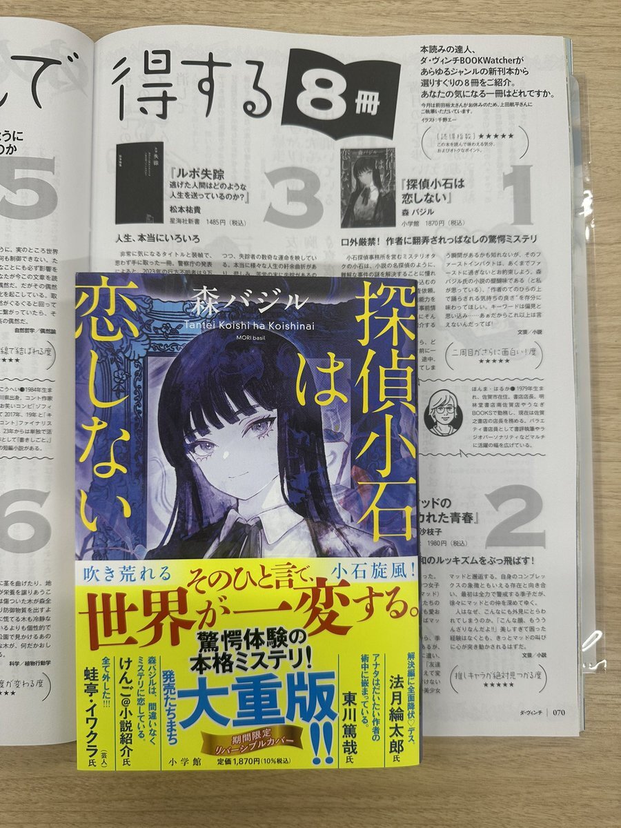 【ご紹介いただきました🎉】 「ダ・ヴィンチ」(@davinci_editor )12月号の「絶対読んで得する8冊」のなかで、本間悠さん(@honyanohomma )が『探偵小石は恋しない』(森バジル@mori_basil 著)をご紹介くださいました。ありがとうございます…!!😭💘 #探偵小石は恋しない pic.x.com/DSdF0aV0Pc