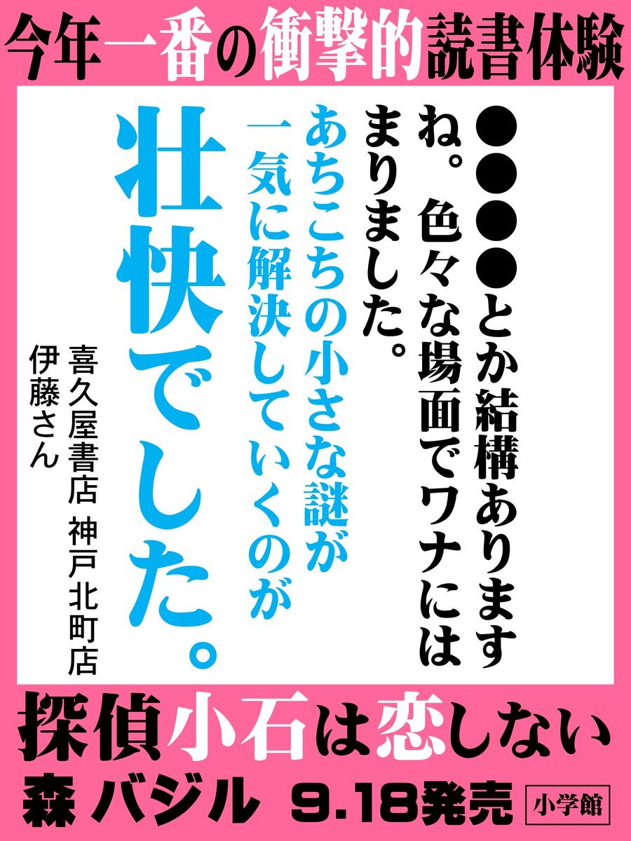 \今年一番の衝撃的読書体験!/ 『探偵小石は恋しない』(森バジル) 大反響につき続々重版決定です🎉🎉 全国の書店員様からいただいたご感想を紹介! 本日は喜久屋書店 神戸北町店の伊藤さんの感想です📖 ⚠️ネタバレ“全開”の感想は特設サイトまで⚠️ shogakukan.co.jp/pr/tanteikoish… #探偵小石は恋しない pic.x.com/rkY2mx6Ipv