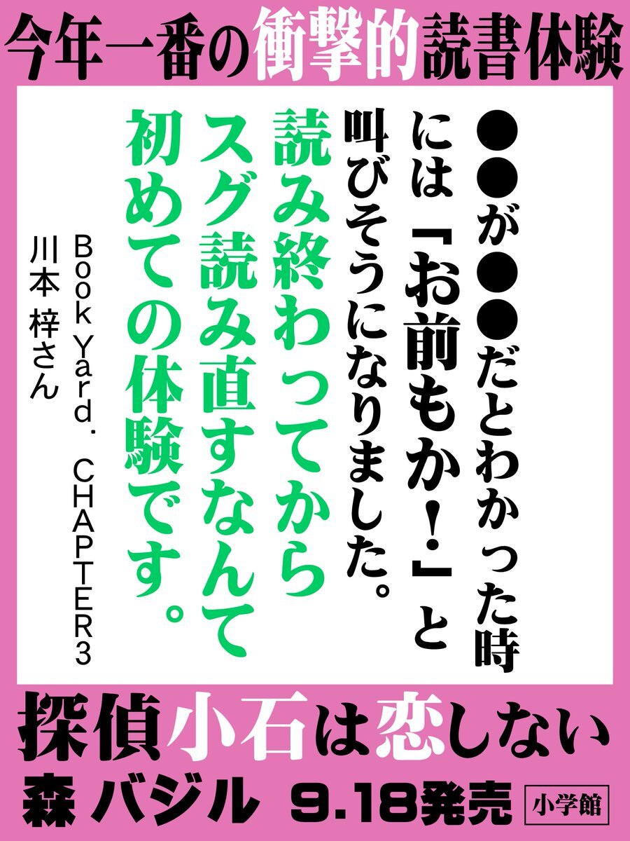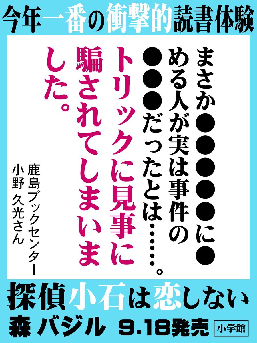 \今年一番の衝撃的読書体験!/ 『探偵小石は恋しない』(森バジル) 大反響につき続々重版決定です🎉🎉 全国の書店員様からいただいたご感想を紹介! 本日は鹿島ブックセンターの小野 久光さんの感想です📖 ⚠️ネタバレ“全開”の感想は特設サイトまで⚠️ shogakukan.co.jp/pr/tanteikoish… #探偵小石は恋しない pic.x.com/9DmSJ3dYjc