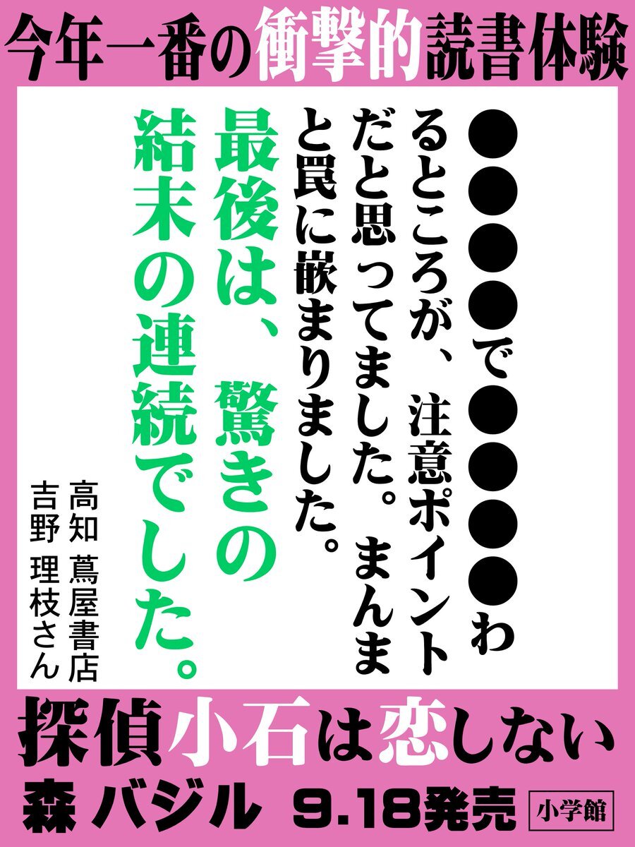 \今年一番の衝撃的読書体験!/ 『探偵小石は恋しない』(森バジル) 大反響につき続々重版決定です🎉🎉 全国の書店員様からいただいたご感想を紹介! 本日は高知 蔦屋書店の吉野 理枝さんの感想です📖 ⚠️ネタバレ“全開”の感想は特設サイトまで⚠️ shogakukan.co.jp/pr/tanteikoish… #探偵小石は恋しない pic.x.com/nJMbCTLQEq