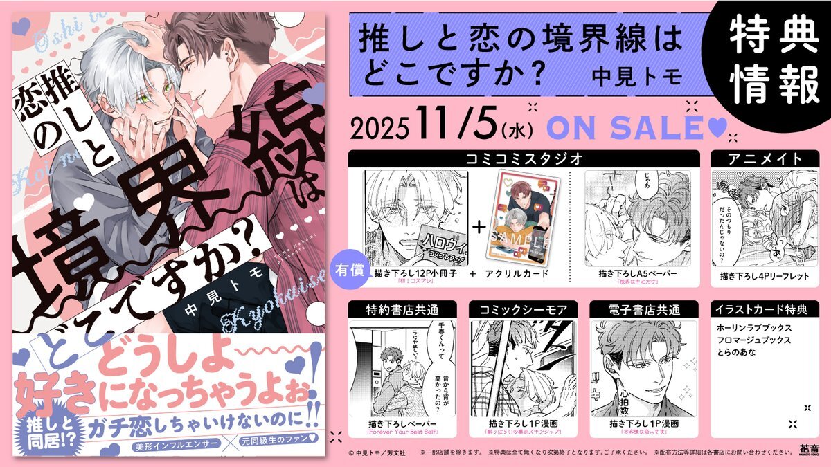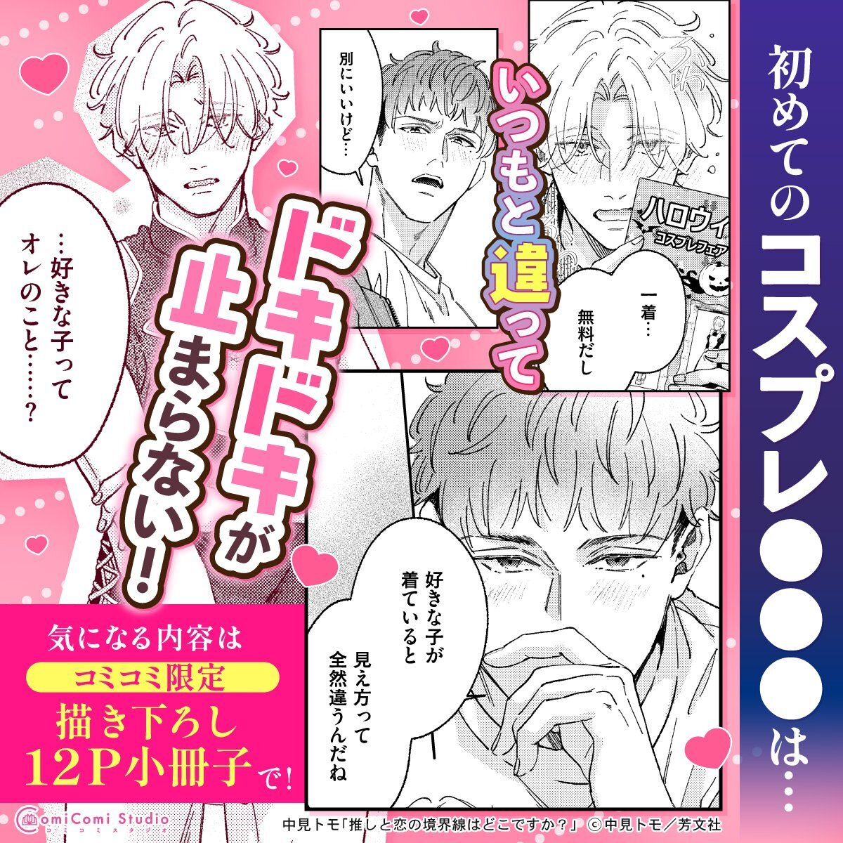 / 🎉好評発売中!!🎉 🎁コミコミ有償特典つき \ 11月5日発売 ❤️‍🔥「#推しと恋の境界線はどこですか?」 #中見トモ 先生(@wagahai_0v0) 有償特典:描き下ろし12P小冊子+アクリルカード 無償特典:描き下ろしA5漫画ペーパー 詳細👇 comicomi-studio.com/goods/detail/2… pic.x.com/g316QjKQWQ
