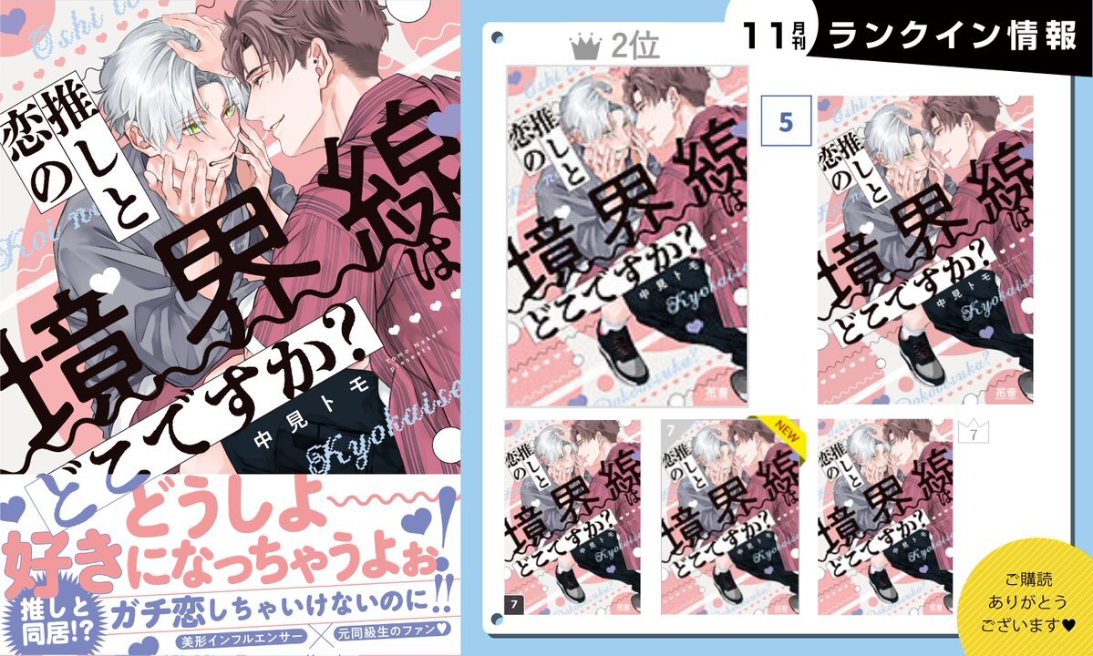 💜ランキング情報💜 「#推しと恋の境界線はどこですか?」 #中見トモ 先生(@wagahai_0v0) BLデイリーランキングにランクイン💘 💖ブッコミ 2 位 💜アニメイトブックストア 5位 💚DMMブックス 7位 💙amebaマンガ 7位 💛BOOK☆WALKER 7位 ご愛読ありがとうございます! pic.x.com/NdNlohpsfY