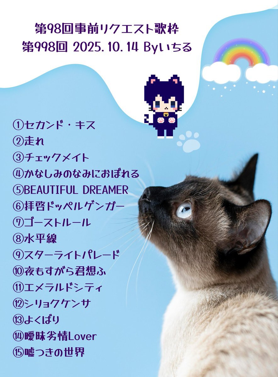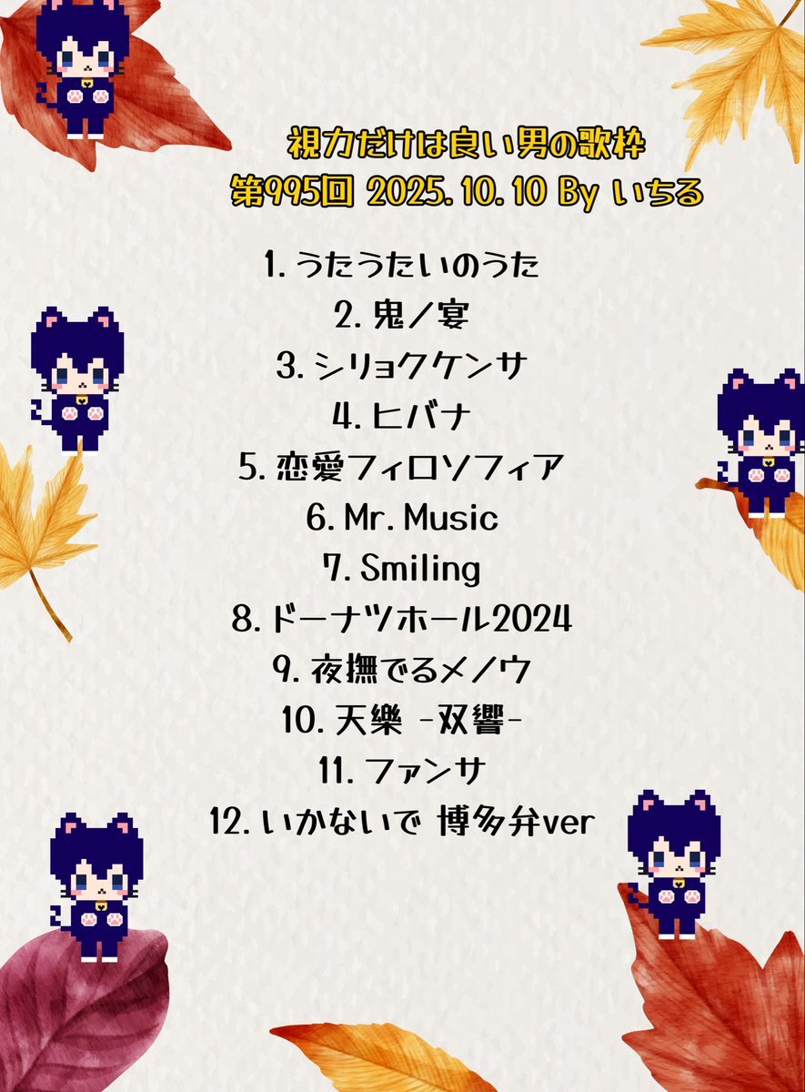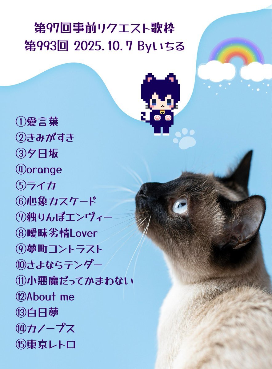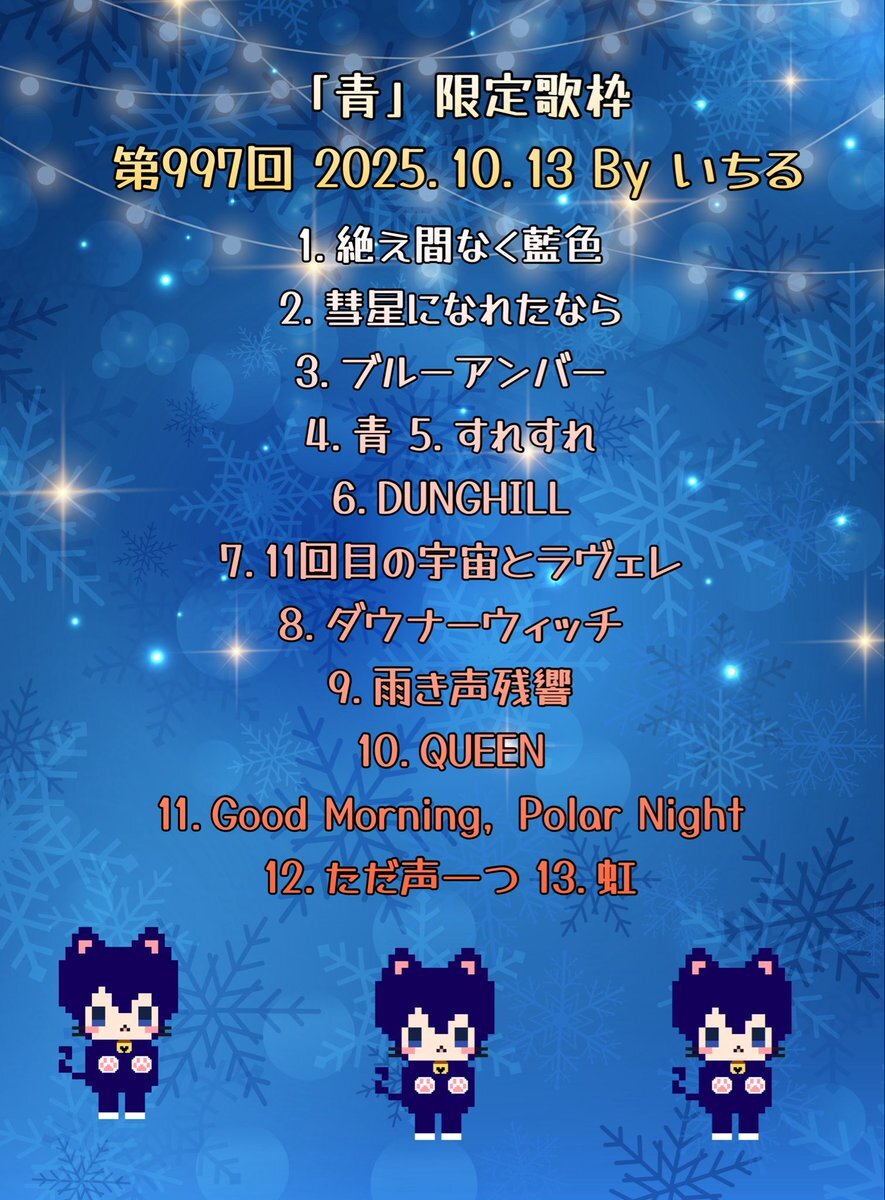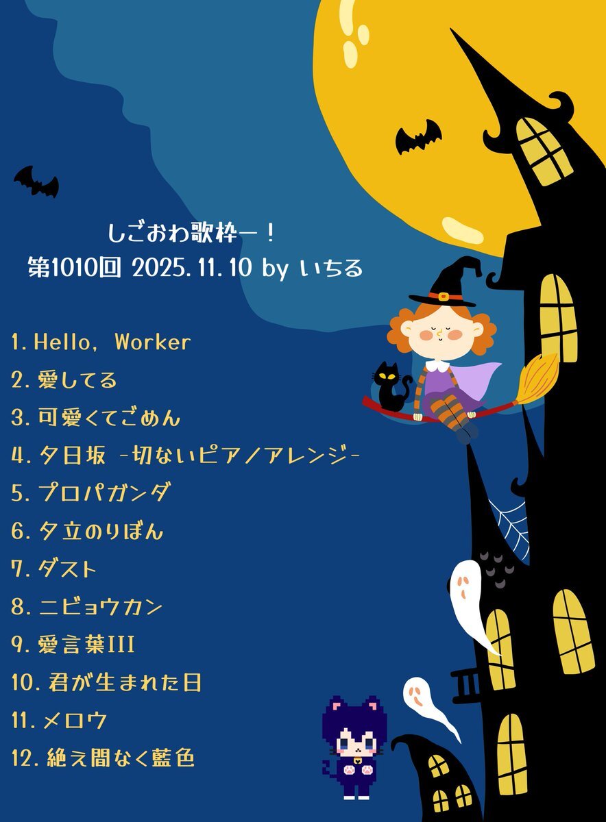 いちるくん歌枠セトリ4枚完成🎤✨ 最後のボカロメドレーの🦍最高すぎた(*`ω´)b青の限定も好き曲で癒される🐈⬛💙 🍮996回💛 twitcasting.tv/g:113078917241… 🍮997回💛 twitcasting.tv/g:113078917241… 🍮999回💛 twitcasting.tv/g:113078917241… #いっちー聞いて #推しマガセトリ pic.x.com/lxJ1IvEwU1