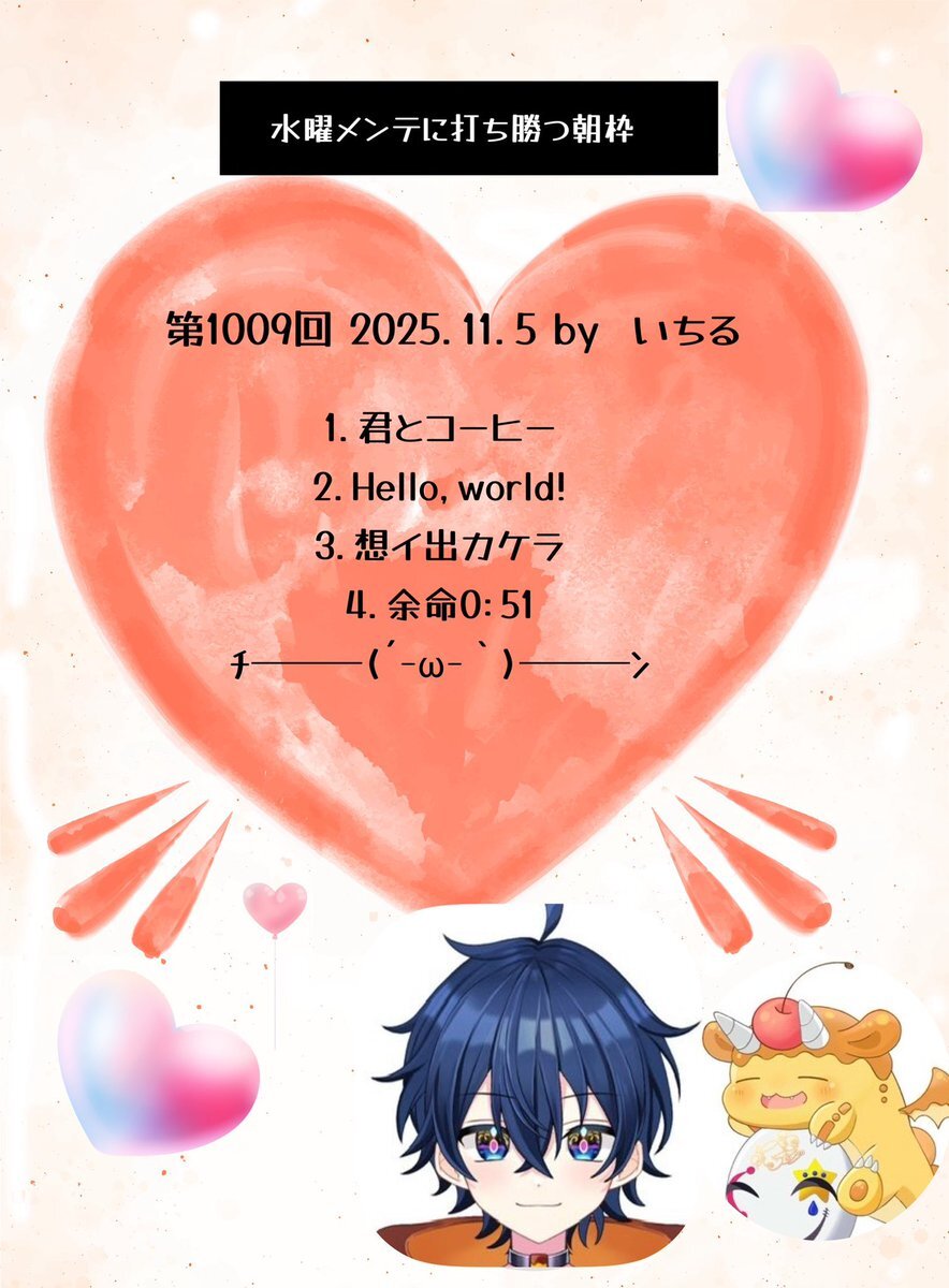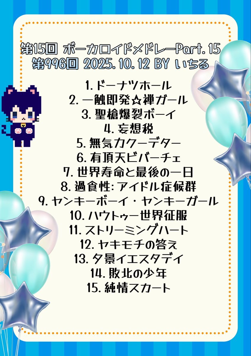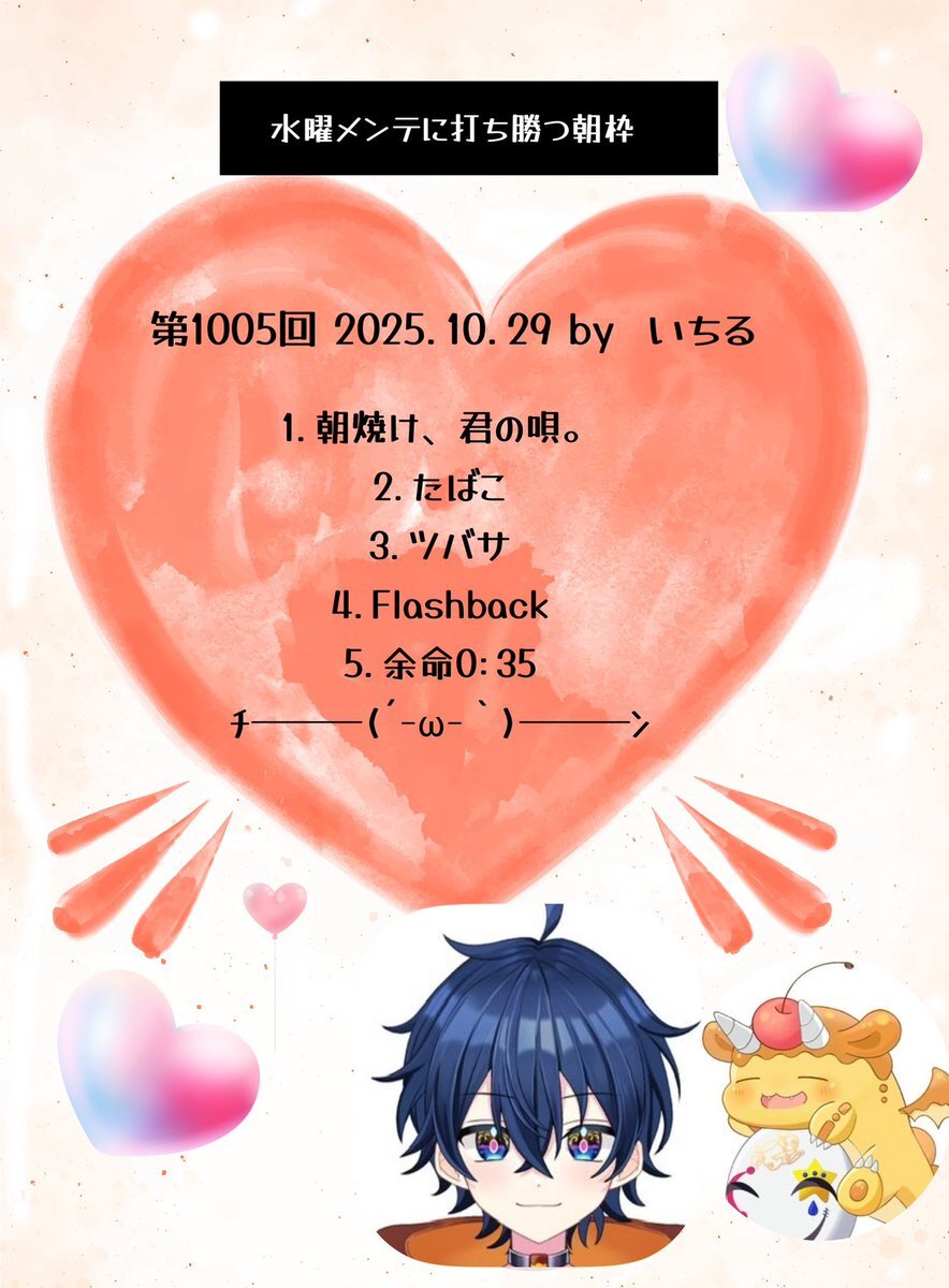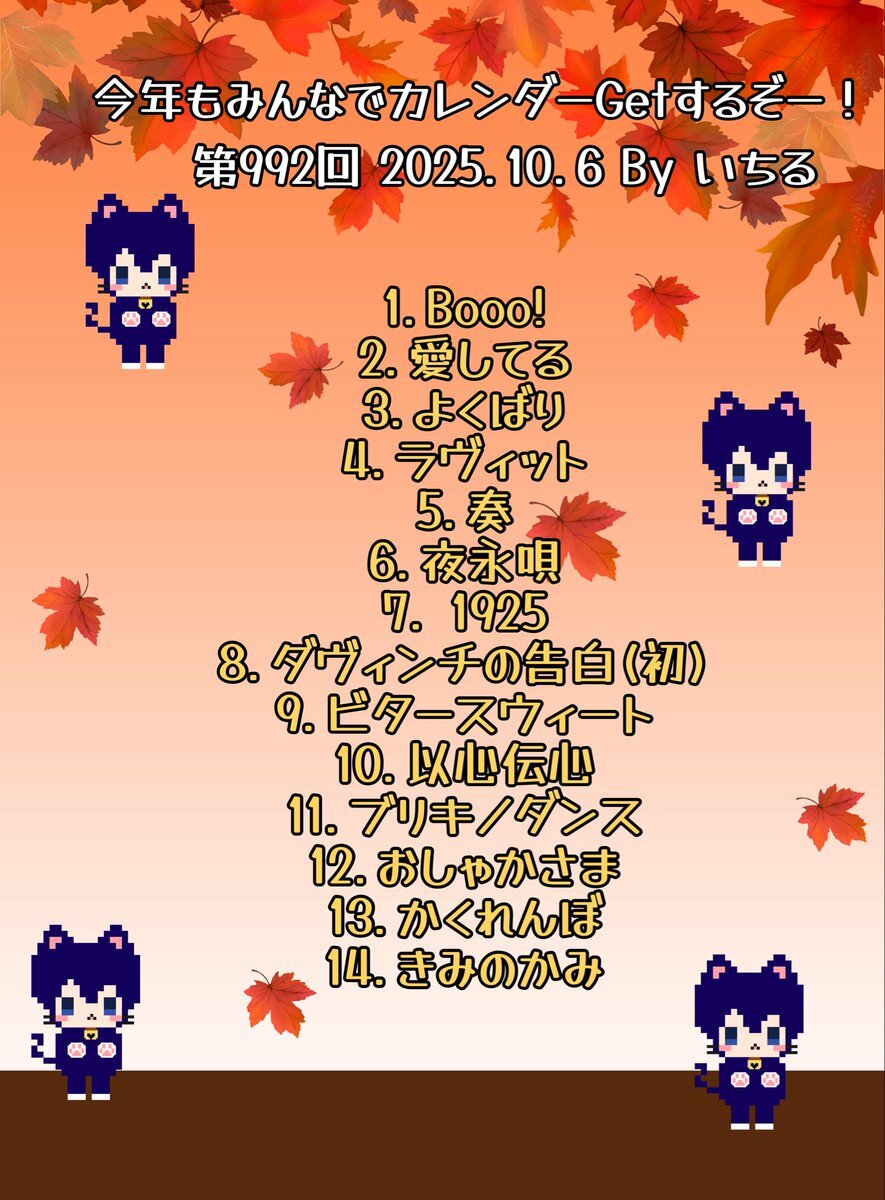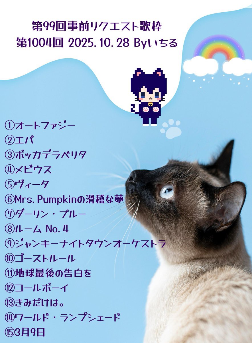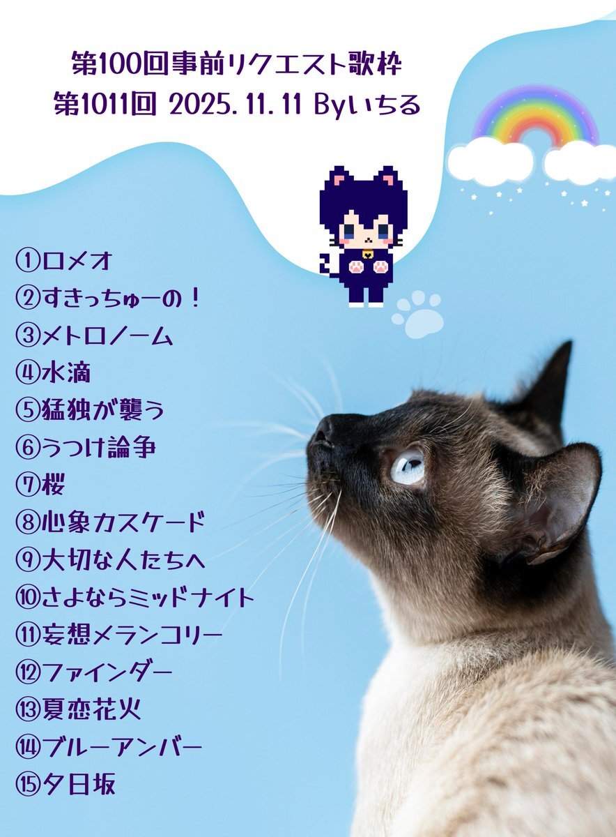 いちるくん歌枠セトリ4枚完成🎤✨ 最後のボカロメドレーの🦍最高すぎた(*`ω´)b青の限定も好き曲で癒される🐈⬛💙 🍮996回💛 twitcasting.tv/g:113078917241… 🍮997回💛 twitcasting.tv/g:113078917241… 🍮999回💛 twitcasting.tv/g:113078917241… #いっちー聞いて #推しマガセトリ pic.x.com/lxJ1IvEwU1