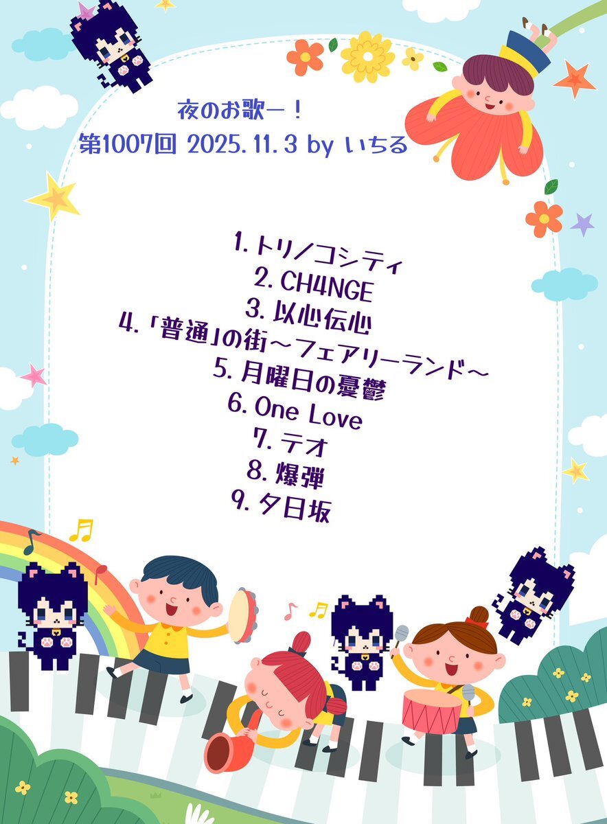 いちるくんの歌枠セトリ4枚完成🎤 いい推しの日に以心伝心を聴けて 大満足でした💯☺️ 🍮1005回💛 twitcasting.tv/g:113078917241… 🍮1006回💛 twitcasting.tv/g:113078917241… 🍮1007回💛 twitcasting.tv/g:113078917241… #いっちー聞いて #推しマガセトリ pic.x.com/ONy5QJ0a4v