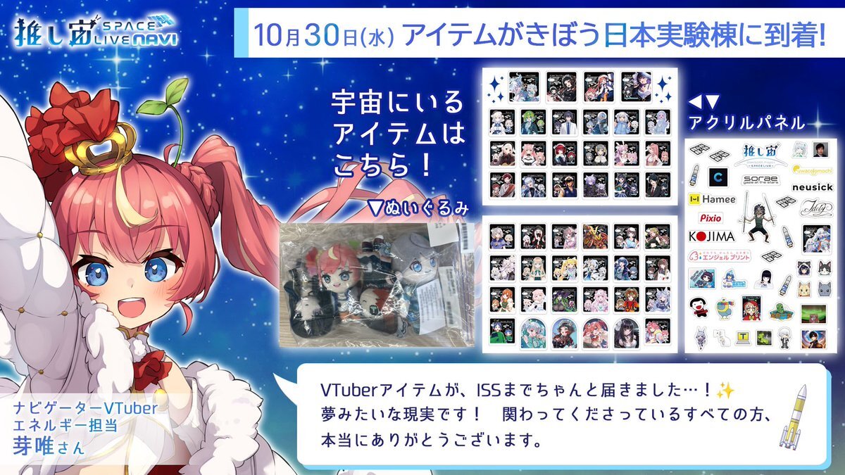 【お知らせ】 昨日10月30日、国際宇宙ステーション「きぼう」日本実験棟に #推し宙スペースライブ のぬいぐるみとアクリルパネルが到着しました! 今回はナビゲーターVTuberの芽唯さん(@mei_garden)にコメントをいただきました! 皆さんも空を見上げて、宇宙に思いを馳せてみてください✨ pic.x.com/5yqluNY4Le
