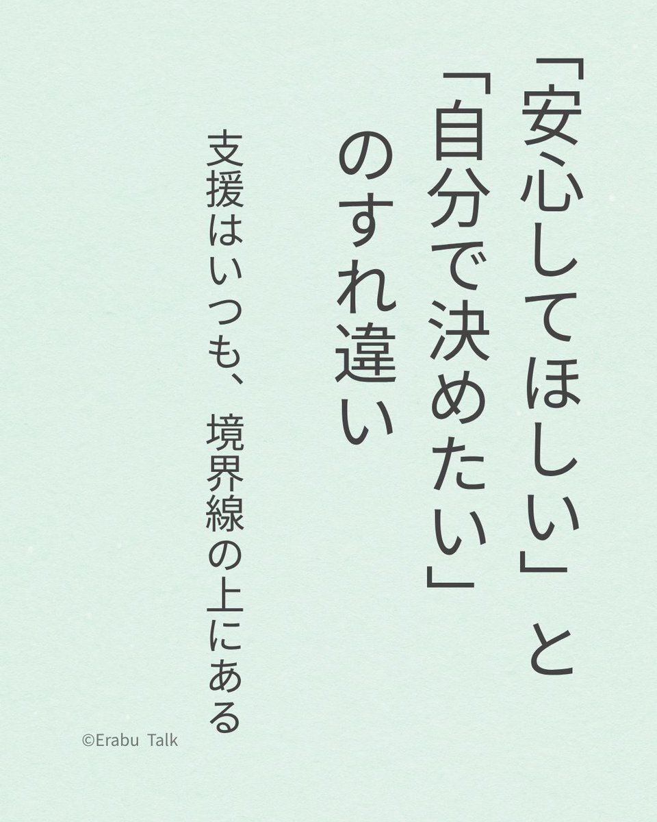 「安心してほしい」と願う家族と 「自分で決めたい」と願う本人。 そのすれ違いは どの家庭にも起きうる「静かな衝突」 → noteで続きを読む note.com/erabutalk/n/n3… #家族のこと #選択の葛藤 #支援のかたち pic.x.com/y94IbkdZVX