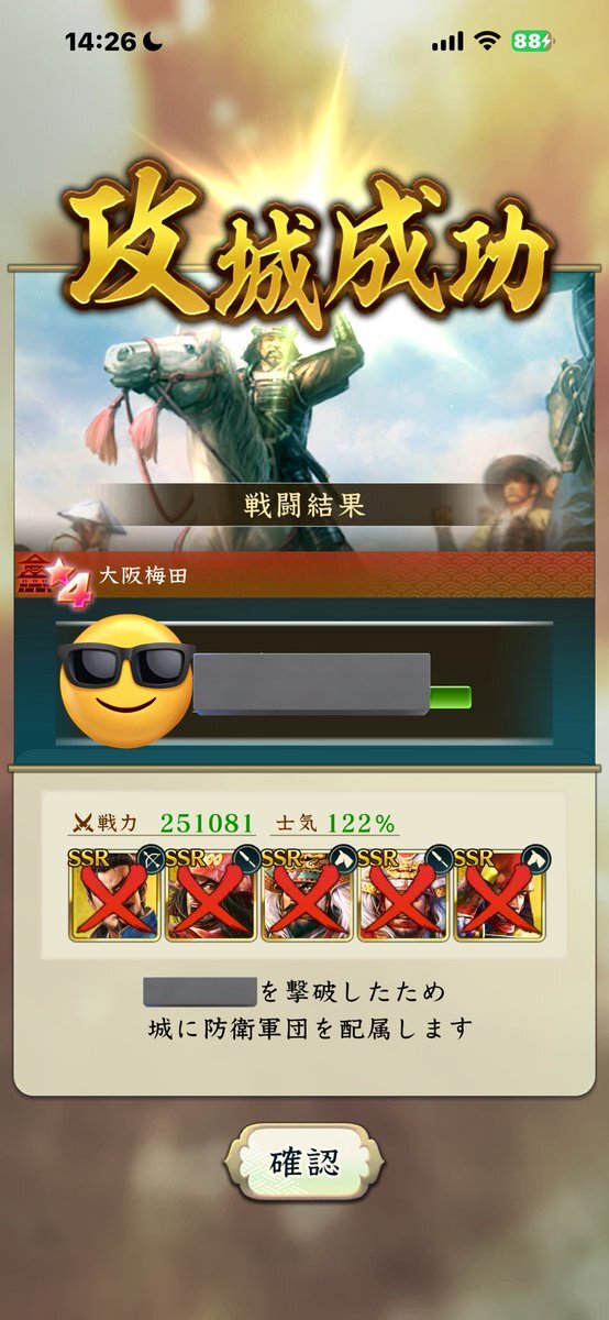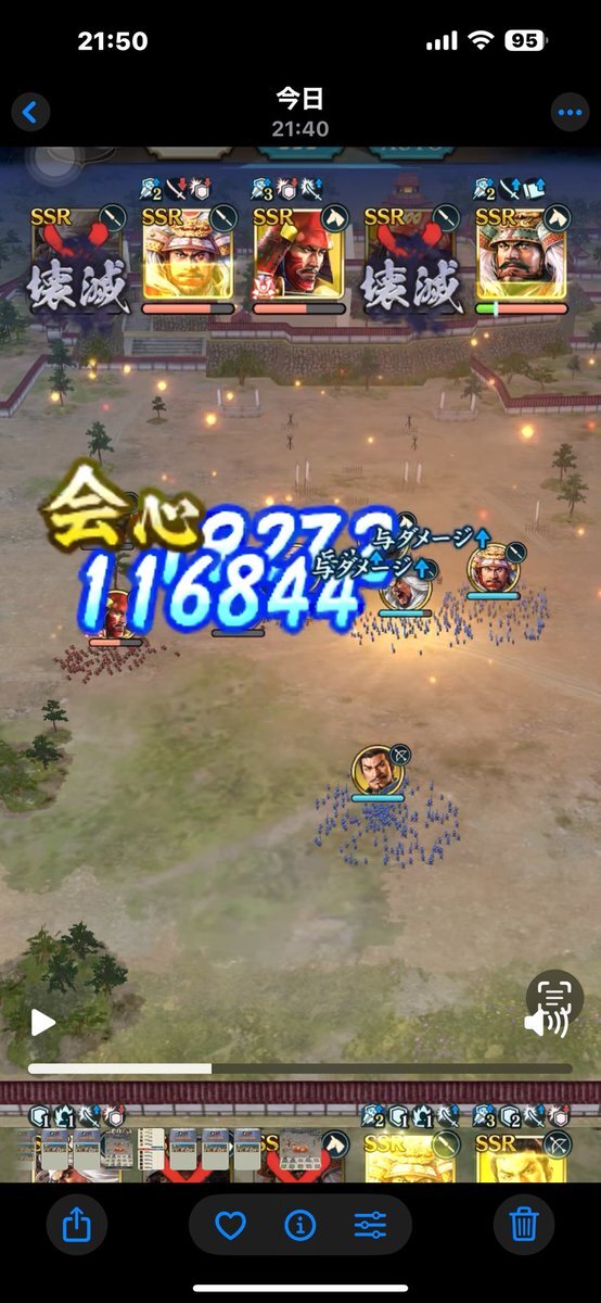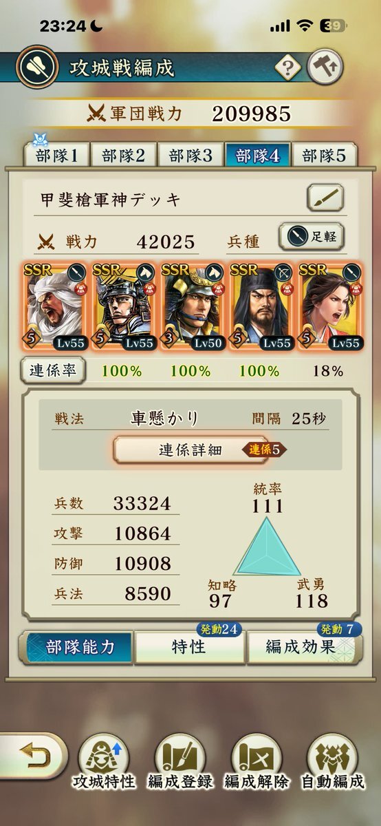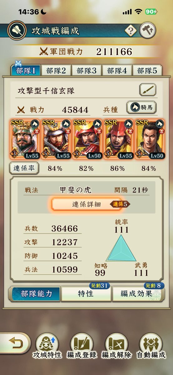 #信長の野望出陣 と言うわけで、育ててきた当方「攻撃型千信玄隊」、ついに #攻城戦 デビュー! 副将に900飯富・完凸特性で攻撃アップと、信繁に「陣旗」装備で戦法威力アップ。 武勇&知略戦法で、結論大阪の某強豪さんの「武田200%バリアズ」に「貫通平均3万5千ダメ」❗️🥊💥 ただし(続く) pic.x.com/dOLHmp0N04