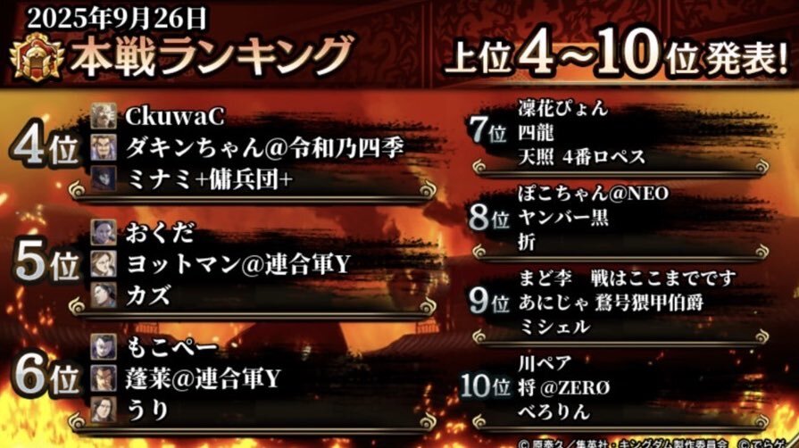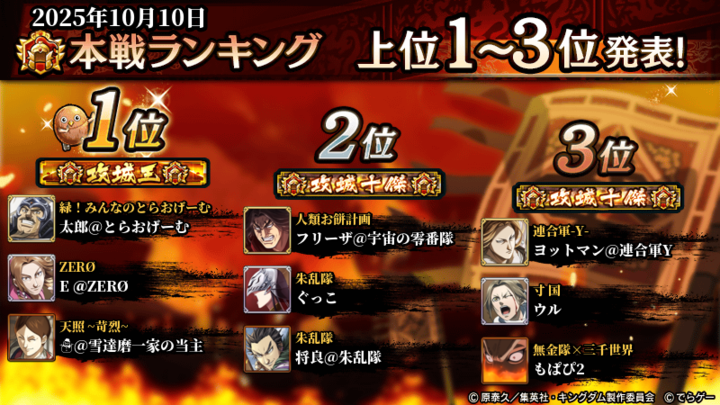 こんにちは!運用担当Tです! 攻城戦ランキングを発表です🏆 3位以内に入賞したのはこちらの9名です!おめでとうございます👏 次回の攻城戦もお楽しみに! 攻城戦ランキング kingdomran.jp/info/251013kou… #キングダム乱 #キンラン #攻城戦 pic.x.com/hsbyB9awTS