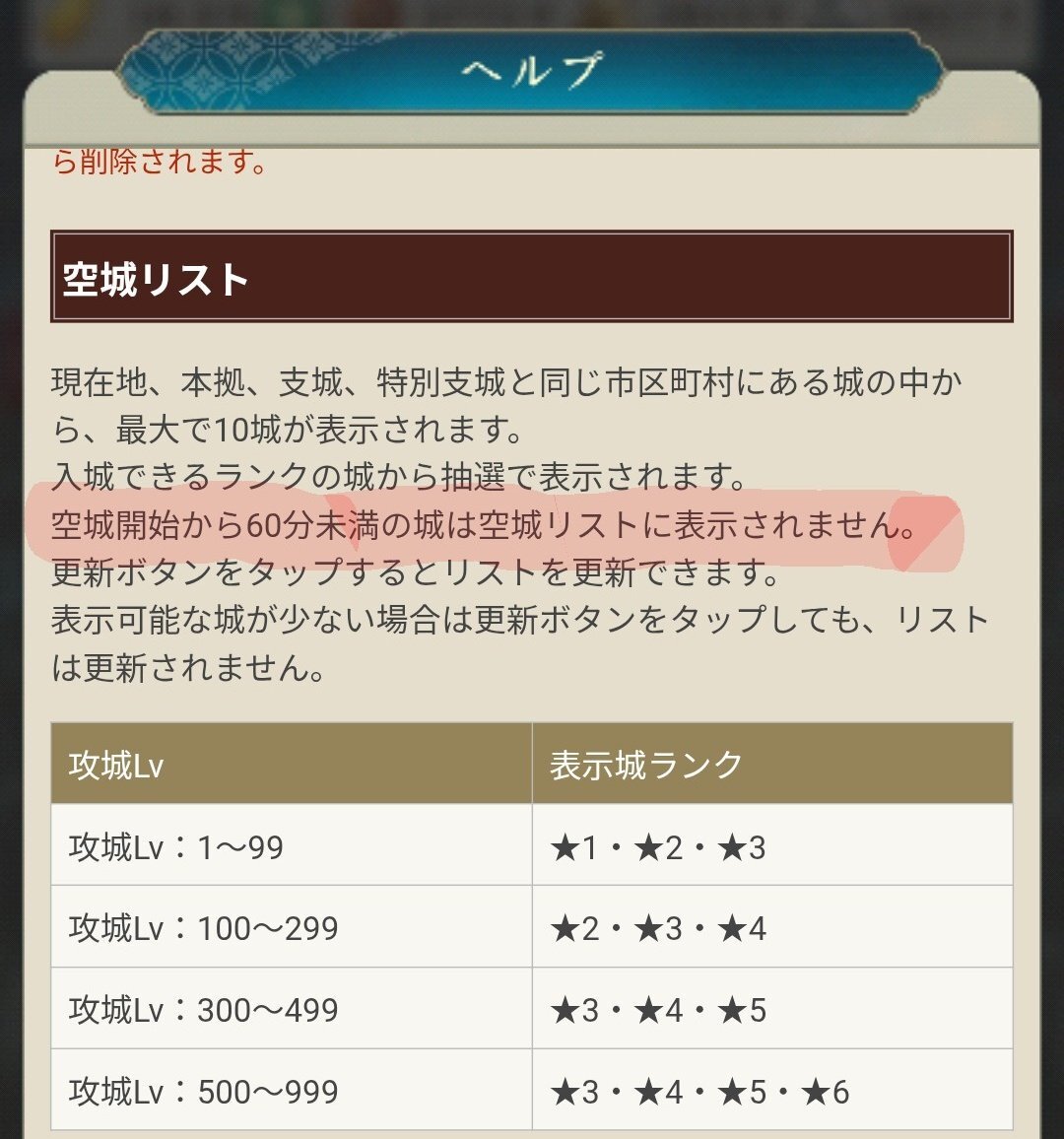 あ、ちゃんと書いてた(下の表)。やっぱり攻城戦レベルに応じて空城リストに表示される城のランクは変わる(攻城戦レベルによって低ランク城は表示されなくなる)のか。やっぱ空城巡りせなアカンやん #信長出陣 #攻城戦 pic.x.com/5DJBXN6pEp