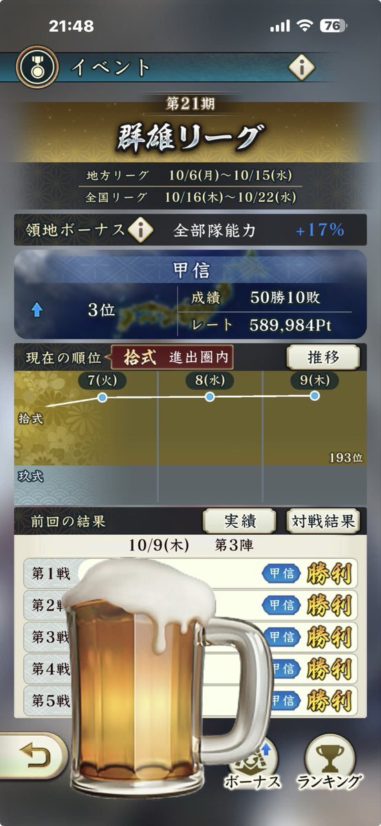 デッキ変更が吉と出たのか1位2位の方々との直接対決に勝利✨ てづぅ〜さんには連敗中💦 ラスボスはてづぅ〜さんか? いや他にも苦手な覇王丸さんもいるし…ワンチャン表彰台狙いへの道は険しく遠い🤔 #信長の野望出陣 #信長出陣 #攻城戦 pic.x.com/B7U7sNU3RD