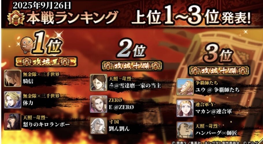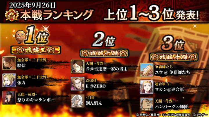 こんにちは!運用担当Tです! 攻城戦ランキングを発表です🏆 3位以内に入賞したのはこちらの9名です!おめでとうございます👏 次回の攻城戦もお楽しみに! 攻城戦ランキング kingdomran.jp/info/250929kou… #キングダム乱 #キンラン #攻城戦 pic.x.com/3vm5eI24VY