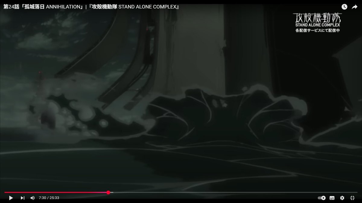 さぁ、 ここから一気に1話数150カット越えの 3Dの連続になります。 昔の作品ですがよろしくお願いします 第24話「孤城落日 ANNIHILATION」|『攻殻機動隊 STAND ALONE COMPLEX』 youtube.com/watch?v=aZWkCZ… #攻殻機動隊 #ghostintheshell #攻殻機動隊SAC #standalonecomplex