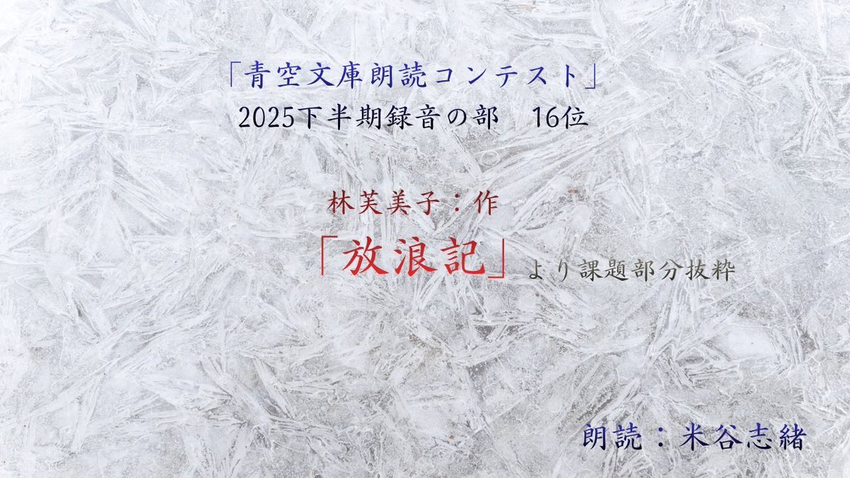 ✨UPしました✨ 「放浪記」課題部分抜粋 作:林芙美子 朗読:米谷志緒 (10位以内だと公式チャンネルで公開となりますが、16位のため自分で載せました!) youtu.be/XCzJAmPQu00?si… 是非お聴き下さい! #朗読 #林芙美子 #放浪記 #青空文庫朗読コンテスト pic.x.com/4VQ5XBACgy